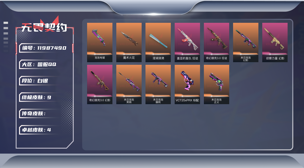 [11987490]【套装】:末日泡泡套装 【英雄】:炼狱,暮蝶,捷风,雷兹,幽影,不死鸟,贤者,猎枭,蝰蛇,芮娜,尚勃勒,霓虹,斯凯,盖可 【近战 武器】:近战武器-泡泡电锯,近战武器-魔术火花,近战武器-澄湖潋滟,近战武器-魔术火花 【狂徒】:狂徒-盖亚的复仇,狂徒-奇幻朋克//3.0 【幻影】:幻影-末日泡泡,幻影-侦察力量,幻影-奇幻朋克//3.0 【冥驹】:冥驹-末日泡泡 【奥丁】:奥丁-神罚 【骇灵】:骇灵-无限竞技 【蜂刺】:蜂刺-末日泡泡 【VCT手枪】:标配-VCT25 x PRX 【正义】:正义-末日泡泡 【卡面】:无畏契约GO!第一卷:芮娜 卡面,无畏契约GO!第一卷:零 卡面,《双城之战》金克丝 卡面,代号红色 卡面,新兵报到 卡面,V契约 卡面,无畏契约 卡面 【喷漆】:霓光四射 喷漆,买装还是存钱 喷漆,关门放狗 喷漆,放下武器 喷漆,胜利属于无畏契约 喷漆,GLHF 喷漆,无畏契约 喷漆 【挂饰】:无畏契约GO!第一卷 零 挂饰,鱼骨头 挂饰,薰衣草之心 挂饰,红鳞松叶 挂饰,《双城之战》魄罗 挂饰,无畏契约 纪念币 挂饰