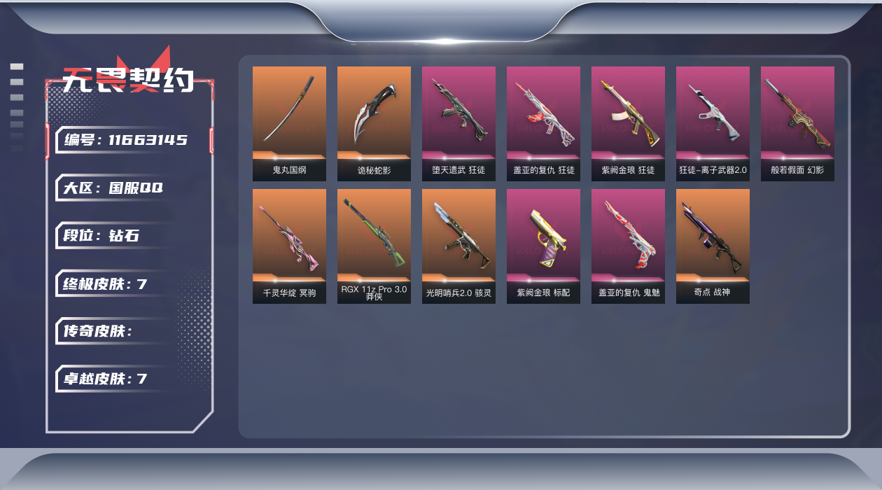 [11663145]【英雄】:幻棱,炼狱,暮蝶,壹决,铁臂,捷风,雷兹,幽影,不死鸟,贤者,猎枭,蝰蛇,零,芮娜,奇乐,尚勃勒,霓虹,夜露,K/O,盖可,黑梦 【近战 武器】:近战武器-鬼丸国纲,近战武器-诡秘蛇影 军刀 【狂徒】:狂徒-堕天遗武,狂徒-盖亚的复仇,狂徒-紫阙金琅,狂徒-离子武器//2.0,狂徒-诡秘蛇影 【幻影】:幻影-般若假面,幻影-末日之翼 【戍卫】:戍卫-折光棱晶 【冥驹】:冥驹-千灵华绽 【飞将】:飞将-末日之翼 【莽侠】:莽侠-RGX 11z Pro//3.0,莽侠-诡秘蛇影 【战神】:战神-奇点 【奥丁】:奥丁-末日之翼 【判官】:判官-诡秘蛇影 【骇灵】:骇灵-光明哨兵//2.0 【蜂刺】:蜂刺-折光棱晶 【标配】:标配-紫阙金琅,标配-折光棱晶 【正义】:正义-纳米打击 【鬼魅】:鬼魅-盖亚的复仇,鬼魅-诡秘蛇影 【短炮】:短炮-末日之翼 【卡面】:进入射程 卡面,精灵大战 卡面,南瓜盛典 卡面,无畏契约GO!第一卷:芮娜 卡面,无畏契约GO!第一卷:零 卡面,代号红色 卡面,新兵报到 卡面,V契约 卡面,无畏契约 卡面 【喷漆】:嗨宝南瓜灯 喷漆,控场勿近 喷漆,买装还是存钱 喷漆,暴走萝莉 喷漆,放下武器 喷漆,胜利属于无畏契约 喷漆,GLHF 喷漆,无畏契约 喷漆 【挂饰】:悠闲鸡块 挂饰,伞绳 挂饰,第九季//第三幕 纪念币 挂饰,无畏契约GO!第一卷 零 挂饰,鱼骨头 挂饰,传世莲华 挂饰,天外飞客 挂饰,海豹的认可 挂饰,无畏契约 纪念币 挂饰