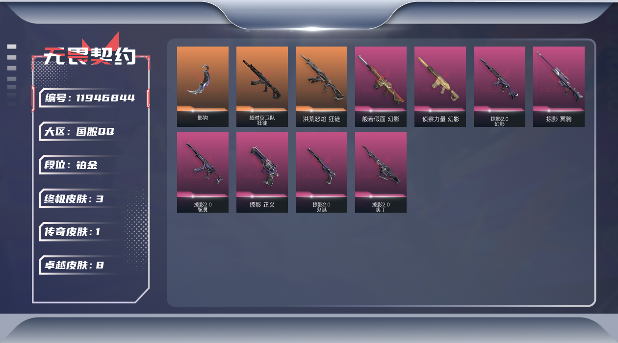 [11946844]【套装】:掠影//2.0套装 【英雄】:幻棱,炼狱,暮蝶,壹决,捷风,雷兹,幽影,不死鸟,贤者,猎枭,蝰蛇,芮娜,尚勃勒,夜露,黑梦,钢锁 【近战 武器】:近战武器-影钩 【狂徒】:狂徒-超时空卫队,狂徒-洪荒怒焰 【幻影】:幻影-般若假面,幻影-侦察力量,幻影-掠影//2.0 【冥驹】:冥驹-掠影 【奥丁】:奥丁-掠影//2.0 【骇灵】:骇灵-掠影//2.0 【正义】:正义-掠影 【鬼魅】:鬼魅-掠影//2.0 【卡面】:树懒大作战 卡面,《双城之战》金克丝 卡面,战术小伙伴 卡面,代号红色 卡面,新兵报到 卡面,V契约 卡面,无畏契约 卡面 【喷漆】:霓光四射 喷漆,关门放狗 喷漆,胜利属于无畏契约 喷漆,GLHF 喷漆,无畏契约 喷漆 【挂饰】:无畏契约GO!第一卷 零 挂饰,瞬云履 挂饰,薰衣草之心 挂饰,红鳞松叶 挂饰,无畏契约 纪念币 挂饰