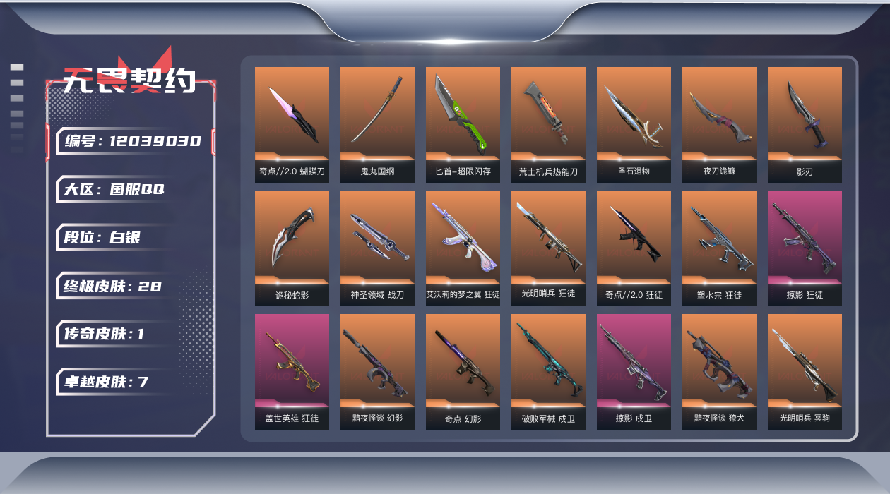[12039030]皮肤资产价值56040/已用R点1310/【套装】:光明哨兵套装,奇点//2.0套装,黯夜怪谈套装,回火礼包:奇点套装,掠影套装 【英雄】:幻棱,炼狱,维斯,暮蝶,钛狐,铁臂,捷风,雷兹,幽影,不死鸟,贤者,猎枭,零,芮娜,霓虹,盖可,钢锁 【近战 武器】:近战武器-奇点//2.0 蝴蝶刀,近战武器-鬼丸国纲,近战武器-超限闪存 匕首,近战武器-荒土机兵 热能刀,近战武器-圣石遗物,近战武器-夜刃诡镰,近战武器-影刃,近战武器-诡秘蛇影 军刀,近战武器-神圣领域 战刀 【狂徒】:狂徒-艾沃莉的梦之翼,狂徒-光明哨兵,狂徒-奇点//2.0,狂徒-塑水宗,狂徒-掠影,狂徒-盖世英雄,狂徒-荒土机兵,狂徒-诡秘蛇影 【幻影】:幻影-黯夜怪谈,幻影-奇点,幻影-超限闪存,幻影-神圣领域,幻影-纳米打击,幻影-末日之翼 【戍卫】:戍卫-破败军械,戍卫-掠影,戍卫-浮光跃金,戍卫-逆冲蛮牛,戍卫-月球哨兵,戍卫-折光棱晶 【獠犬】:獠犬-黯夜怪谈,獠犬-神圣领域,獠犬-模拟赫兹,獠犬-逆冲蛮牛 【冥驹】:冥驹-光明哨兵,冥驹-千灵华绽,冥驹-掠影,冥驹-荒土机兵,冥驹-模拟赫兹,冥驹-星云暗涌 【飞将】:飞将-黯夜怪谈,飞将-末日之翼 【莽侠】:莽侠-超限闪存,莽侠-诡秘蛇影,莽侠-月球哨兵 【战神】:战神-光明哨兵,战神-奇点,战神-神圣领域,战神-浮光跃金 【奥丁】:奥丁-光明哨兵//2.0,奥丁-纳米打击,奥丁-末日之翼 【判官】:判官-天界神兵//2.0,判官-诡秘蛇影,判官-纳米打击x 【雄鹿】:雄鹿-紫阙金琅//2.0,雄鹿-模拟赫兹,雄鹿-逆冲蛮牛,雄鹿-月球哨兵 【骇灵】:骇灵-奇点,骇灵-荒土机兵,骇灵-浮光跃金,骇灵-星云暗涌 【蜂刺】:蜂刺-超限闪存,蜂刺-星云暗涌,蜂刺-折光棱晶 【标配】:标配-黯夜怪谈,标配-荒土机兵,标配-浮光跃金,标配-折光棱晶 【正义】:正义-光明哨兵,正义-奇点,正义-掠影,正义-超限闪存,正义-纳米打击,正义-月球哨兵 【鬼魅】:鬼魅-奇点//2.0,鬼魅-诡秘蛇影,鬼魅-模拟赫兹,鬼魅-星云暗涌 【狂怒】:狂怒-神圣领域,狂怒-逆冲蛮牛 【短炮】:短炮-末日之翼 【卡面】:终章:激斗汉堡 卡面,进入射程 卡面,分崩离析 卡面,纳米打击 卡面,抑制技术 卡面,激斗汉堡 卡面,瓦娃脸雪糕 P2 卡面,从黄昏到黎明 卡面,荒土