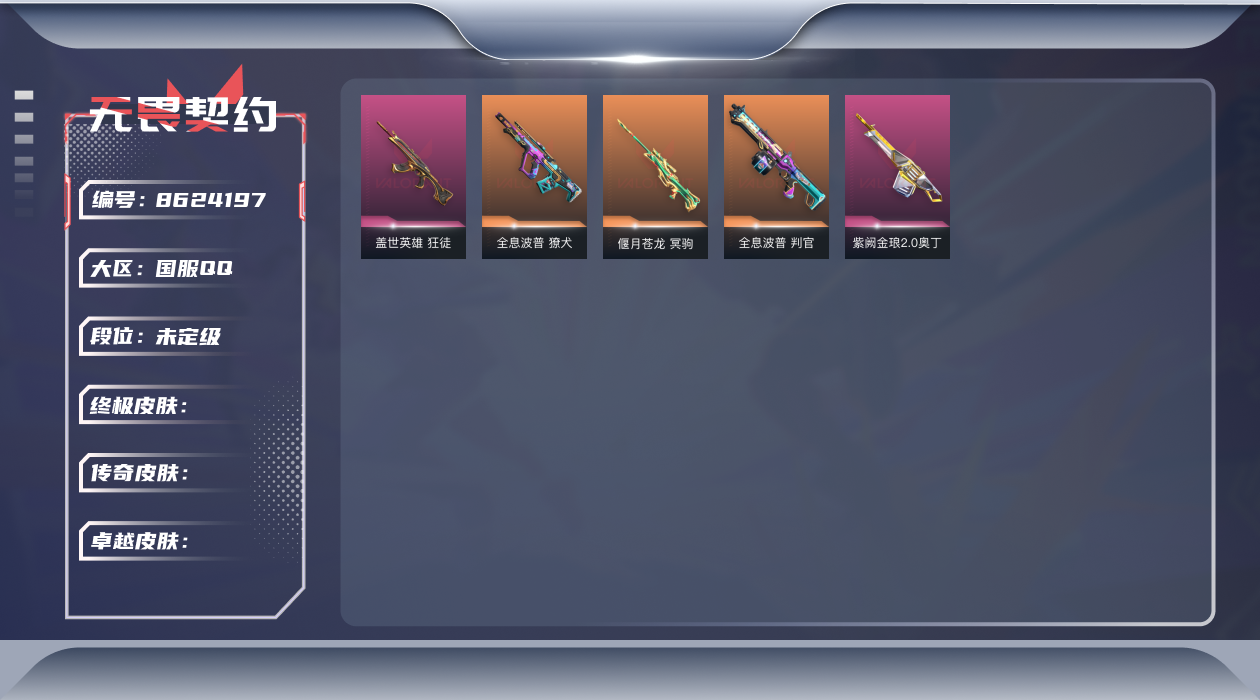 [8624197]Lv93 ,未定级,英雄24,皮肤52,卡面68,喷漆76,挂件49,破败军械套装,耀鳞威龙套装 【区服】QQ 【游戏等级】Lv93 【游戏段位】未定级 【皮肤资产价值】22650 【使用R点】515 【英雄数量】24 【皮肤数量】52 【卡面数量】68 【喷漆数量】76 【挂件数量】49 【拥有套装】破败军械套装(破败军械-幻影,破败军械-戍卫,破败军械-骇灵,破败军械-鬼魅,破败王者之残刃)耀鳞威龙套装(耀鳞威龙-狂徒,耀鳞威龙-鬼魅,威龙之刃) 【拥有近战武器】珍珠棘贝-短剑,钢轨卫士-战锤,沙尘幻旅-匕首, 【拥有步枪】全息波普-獠犬,盖世英雄-狂徒,珍珠棘贝-幻影,珍珠棘贝-戍卫,钢轨卫士-狂徒,钢轨卫士-戍卫,沙尘幻旅-狂徒,复古浪潮-獠犬,战术小伙伴-獠犬,战术小伙伴-幻影,胡桃狂想-獠犬,萌彩剪影-戍卫, 【拥有狙击枪】偃月苍龙-冥驹,沙尘幻旅-飞将,深海水族-莽侠,复古浪潮-冥驹,光导纤维-飞将,胡桃狂想-冥驹, 【拥有机枪】紫阙金琅//2.0-奥丁,深海水族-战神,战术小伙伴-奥丁,萌彩剪影-战神, 【拥有冲锋枪】珍珠棘贝-骇灵,沙尘幻旅-骇灵,深海水族-蜂刺,战术小伙伴-蜂刺,光导纤维-骇灵,胡桃狂想-蜂刺, 【拥有霰弹枪】全息波普-判官,复古浪潮-雄鹿,萌彩剪影-判官, 【拥有手枪】珍珠棘贝-狂怒,钢轨卫士-短炮,钢轨卫士-狂怒,沙尘幻旅-正义,复古浪潮-正义,深海水族-短炮,光导纤维-鬼魅,光导纤维-标配,萌彩剪影-狂怒,胡桃狂想-鬼魅,