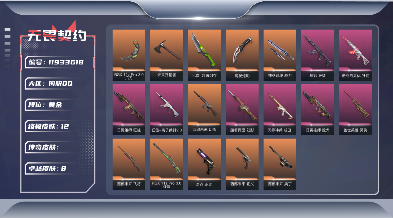 [11933618]【套装】:西部未来套装 【英雄】:幻棱,炼狱,维斯,暮蝶,钛狐,壹决,铁臂,捷风,雷兹,幽影,不死鸟,贤者,猎枭,蝰蛇,零,芮娜,奇乐,尚勃勒,霓虹,斯凯,夜露,星礈,K/O,海神,盖可,黑梦,钢锁 【近战 武器】:近战武器-RGX 11z Pro//3.0 爪刀,近战武器-未来开拓者,近战武器-超限闪存 匕首,近战武器-诡秘蛇影 军刀,近战武器-神圣领域 战刀 【狂徒】:狂徒-掠影,狂徒-盖亚的复仇,狂徒-日冕雄师,狂徒-离子武器//2.0,狂徒-诡秘蛇影 【幻影】:幻影-西部未来,幻影-般若假面,幻影-超限闪存,幻影-神圣领域,幻影-末日之翼,幻影-西部未来 【戍卫】:戍卫-天界神兵,戍卫-浮光跃金,戍卫-月球哨兵,戍卫-折光棱晶 【獠犬】:獠犬-日冕雄师,獠犬-神圣领域,獠犬-模拟赫兹 【冥驹】:冥驹-盖世英雄,冥驹-模拟赫兹,冥驹-星云暗涌 【飞将】:飞将-西部未来,飞将-末日之翼 【莽侠】:莽侠-RGX 11z Pro//3.0,莽侠-超限闪存,莽侠-诡秘蛇影,莽侠-月球哨兵 【战神】:战神-神圣领域,战神-浮光跃金 【奥丁】:奥丁-西部未来,奥丁-末日之翼 【判官】:判官-诡秘蛇影 【雄鹿】:雄鹿-模拟赫兹,雄鹿-月球哨兵 【骇灵】:骇灵-浮光跃金,骇灵-星云暗涌 【蜂刺】:蜂刺-超限闪存,蜂刺-星云暗涌,蜂刺-折光棱晶 【标配】:标配-浮光跃金,标配-折光棱晶 【正义】:正义-奇点,正义-西部未来,正义-超限闪存,正义-纳米打击,正义-游戏结束,正义-月球哨兵 【鬼魅】:鬼魅-诡秘蛇影,鬼魅-模拟赫兹,鬼魅-星云暗涌 【狂怒】:狂怒-神圣领域,狂怒-喷火式 【短炮】:短炮-末日之翼 【卡面】:终章:激斗汉堡 卡面,进入射程 卡面,《双城之战》拥抱 卡面,精灵大战 卡面,欢迎来到底城 卡面,南瓜盛典 卡面,VCT CN首冠 卡面,唱片的故事 卡面,钢弓与箭弦 卡面,排除故障 卡面,战术桌游 卡面,悠享食光 卡面,修车达人 卡面,热舞环节 卡面,模拟赫兹 卡面,浮光跃金 卡面,超限闪存 卡面,维斯工牌 卡面,正义的化身 卡面,时间到 卡面,最高舞台 卡面,声感陷阱设计图 卡面,红鳞松叶 卡面,梦幻奶茶 卡面,零点嗅探设计图 卡面,无畏契约GO!第一卷:芮娜 卡面,复古浪潮 卡面,无畏契约GO!第一卷:零 卡面,化茧成蝶 卡面,无垠星环 卡面,《双城之战》