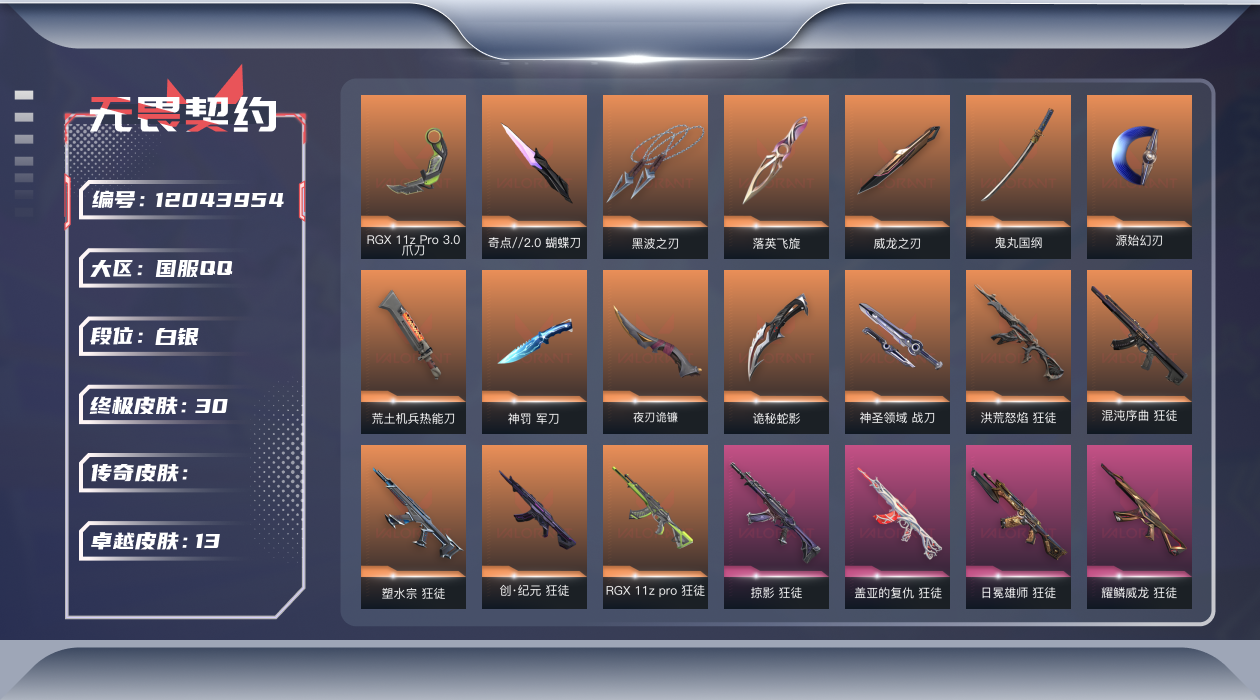[12043954]皮肤资产价值73880 【套装】:耀鳞威龙套装 【英雄】:幻棱,炼狱,维斯,暮蝶,钛狐,壹决,铁臂,捷风,雷兹,幽影,不死鸟,贤者,猎枭,蝰蛇,零,芮娜,奇乐,尚勃勒,霓虹,斯凯,夜露,星礈,K/O,海神,盖可,黑梦,钢锁 【近战 武器】:近战武器-RGX 11z Pro//3.0 爪刀,近战武器-奇点//2.0 蝴蝶刀,近战武器-黑波之刃,近战武器-落英飞旋,近战武器-威龙之刃,近战武器-鬼丸国纲,近战武器-源始幻刃,近战武器-荒土机兵 热能刀,近战武器-神罚 军刀,近战武器-夜刃诡镰,近战武器-诡秘蛇影 军刀,近战武器-神圣领域 战刀 【狂徒】:狂徒-洪荒怒焰,狂徒-混沌序曲,狂徒-塑水宗,狂徒-创·纪元,狂徒-RGX 11z Pro,狂徒-掠影,狂徒-盖亚的复仇,狂徒-日冕雄师,狂徒-耀鳞威龙,狂徒-紫阙金琅,狂徒-荒土机兵,狂徒-诡秘蛇影,狂徒-神罚//2.0 【幻影】:幻影-黯夜怪谈,幻影-千灵华绽,幻影-盖亚的复仇//2.0,幻影-紫阙金琅//2.0,幻影-神圣领域,幻影-纳米打击,幻影-神罚,幻影-末日之翼 【戍卫】:戍卫-天界神兵,戍卫-逆冲蛮牛,戍卫-月球哨兵,戍卫-折光棱晶 【獠犬】:獠犬-归零者,獠犬-神圣领域,獠犬-逆冲蛮牛 【冥驹】:冥驹-堕天遗武,冥驹-荒土机兵,冥驹-星云暗涌 【飞将】:飞将-塑水宗,飞将-末日之翼 【莽侠】:莽侠-RGX 11z Pro//3.0,莽侠-诡秘蛇影,莽侠-月球哨兵 【战神】:战神-奇点,战神-神圣领域 【奥丁】:奥丁-紫阙金琅//2.0,奥丁-纳米打击,奥丁-末日之翼 【判官】:判官-天界神兵//2.0,判官-诡秘蛇影,判官-纳米打击x,判官-神罚 【雄鹿】:雄鹿-紫阙金琅//2.0,雄鹿-逆冲蛮牛,雄鹿-月球哨兵 【骇灵】:骇灵-光明哨兵//2.0,骇灵-荒土机兵,骇灵-星云暗涌 【蜂刺】:蜂刺-星云暗涌,蜂刺-折光棱晶 【标配】:标配-荒土机兵,标配-神罚,标配-折光棱晶 【VCT手枪】:标配-VCT25 x EDG 【正义】:正义-西部未来,正义-纳米打击,正义-月球哨兵 【鬼魅】:鬼魅-耀鳞威龙,鬼魅-诡秘蛇影,鬼魅-星云暗涌,鬼魅-神罚//2.0 【狂怒】:狂怒-全息波普,狂怒-神圣领域,狂怒-逆冲蛮牛 【短炮】:短炮-混沌序曲,短炮-末日之翼 【卡面】:终章:激斗汉堡 卡面,进入射程 卡面,