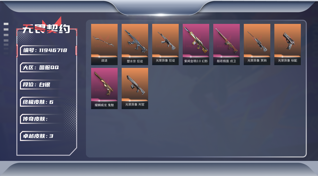 [11946718]【套装】:光荣异象套装 【英雄】:幻棱,炼狱,维斯,暮蝶,钛狐,壹决,铁臂,捷风,雷兹,幽影,不死鸟,贤者,猎枭,蝰蛇,零,芮娜,奇乐,尚勃勒,霓虹,斯凯,夜露,星礈,K/O,海神,盖可,黑梦,钢锁 【近战 武器】:近战武器-光荣异象 歧途 【狂徒】:狂徒-塑水宗,狂徒-光荣异象 【幻影】:幻影-紫阙金琅//2.0 【戍卫】:戍卫-般若假面 【冥驹】:冥驹-光荣异象 【判官】:判官-光荣异象 【标配】:标配-光荣异象,标配-超能偶像 【正义】:正义-超限闪存,正义-纳米打击 【鬼魅】:鬼魅-耀鳞威龙,鬼魅-流星兵团,鬼魅-诡秘蛇影,鬼魅-星云暗涌 【卡面】:终章:激斗汉堡 卡面,进入射程 卡面,《双城之战》拥抱 卡面,精灵大战 卡面,欢迎来到底城 卡面,南瓜盛典 卡面,修车达人 卡面,正义的化身 卡面,终章:生意人麦宝 卡面,铁之华 卡面,时间到 卡面,最高舞台 卡面,声感陷阱设计图 卡面,战术小伙伴的夏日 卡面,梦幻奶茶 卡面,终章:打造专属狂徒 卡面,趁热吃 卡面,源能反应 卡面,零点嗅探设计图 卡面,沙雕爆能器 卡面,无畏契约GO!第一卷:芮娜 卡面,清除名单 卡面,比比看谁快? 卡面,代号红色 卡面,新兵报到 卡面,V契约 卡面,无畏契约 卡面 【喷漆】:嗨宝南瓜灯 喷漆,嘭! 喷漆,都算到了 喷漆,控场勿近 喷漆,小丑猫 喷漆,熊抱 喷漆,超级粉丝 喷漆,捷风差距 喷漆,惊声尖叫 喷漆,拼一枪 喷漆,我觉得不行 喷漆,再来一次? 喷漆,我的刀呢? 喷漆,双击点赞 喷漆,胜利属于无畏契约 喷漆,GLHF 喷漆,无畏契约 喷漆 【挂饰】:终章:猫猫木乃伊 挂饰,悠闲鸡块 挂饰,伞绳 挂饰,《双城之战》小蛋糕 挂饰,第九季//第三幕 纪念币 挂饰,工具腰带 挂饰,无畏契约GO!第一卷 芮娜 挂饰,无畏契约GO!第一卷 零 挂饰,熔岩灯 挂饰,第九季//第二幕 纪念币 挂饰,终章:这瓜保熟 挂饰,糖葫芦 挂饰,袖珍捷风 挂饰,迷你浓缩 挂饰,第九季//第一幕 纪念币 挂饰,终章:迷你机甲 挂饰,战术河童 挂饰,荧光棒 挂饰,第八季//第三幕 纪念币 挂饰,传世莲华 挂饰,第八季//第二幕 纪念币 挂饰 ,无畏契约 纪念币 挂饰