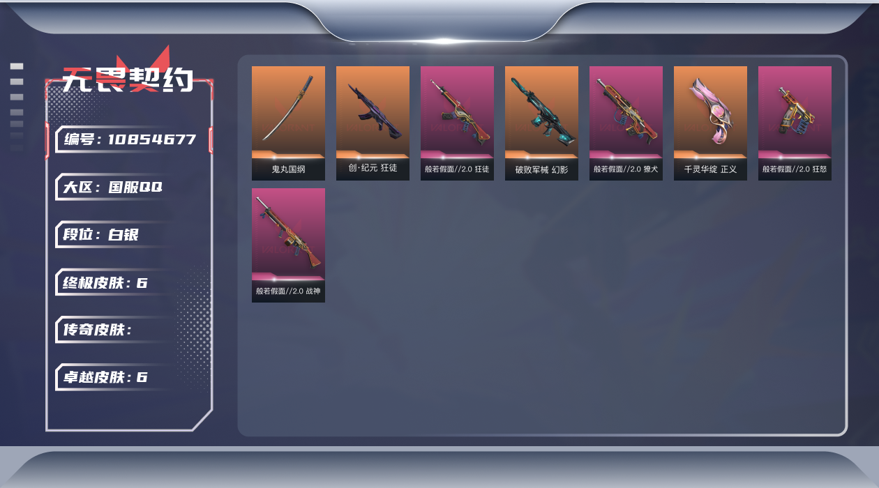 [10854677]【套装】:般若假面//2.0套装 【英雄】:幻棱,炼狱,维斯,暮蝶,钛狐,壹决,铁臂,捷风,幽影,不死鸟,贤者,猎枭,零,芮娜,尚勃勒,霓虹,夜露,星礈,钢锁 【近战 武器】:近战武器-魔术火花,近战武器-鬼丸国纲,近战武器-神圣领域 战刀,近战武器-魔术火花 【狂徒】:狂徒-创·纪元,狂徒-般若假面//2.0,狂徒-奇幻朋克//3.0 【幻影】:幻影-破败军械,幻影-奇幻朋克//3.0,幻影-神圣领域 【戍卫】:戍卫-月球哨兵 【獠犬】:獠犬-般若假面//2.0,獠犬-神圣领域 【冥驹】:冥驹-星云暗涌 【莽侠】:莽侠-月球哨兵 【战神】:战神-般若假面//2.0,战神-神圣领域 【雄鹿】:雄鹿-月球哨兵 【骇灵】:骇灵-星云暗涌 【蜂刺】:蜂刺-星云暗涌 【正义】:正义-千灵华绽,正义-纳米打击,正义-月球哨兵 【鬼魅】:鬼魅-诡秘蛇影,鬼魅-星云暗涌 【狂怒】:狂怒-般若假面//2.0,狂怒-神圣领域 【卡面】:终章:激斗汉堡 卡面,进入射程 卡面,《双城之战》拥抱 卡面,精灵大战 卡面,欢迎来到底城 卡面,南瓜盛典 卡面,无畏契约:暮蝶 卡面,超限闪存 卡面,红鳞松叶 卡面,Clutch 卡面,无畏契约GO!第一卷:芮娜 卡面,无畏契约GO!第一卷:零 卡面,《双城之战》金克丝 卡面,无畏契约GO!第一卷:贤者 卡面,代号红色 卡面,新兵报到 卡面,V契约 卡面,无畏契约 卡面 【喷漆】:嗨宝南瓜灯 喷漆,嘭! 喷漆,都算到了 喷漆,控场勿近 喷漆,图谋不轨的零 喷漆,伤心心 喷漆,皮蛋萌舞 喷漆,UWU 喷漆,一个人的孤岛 喷漆,买装还是存钱 喷漆,关门放狗 喷漆,无畏契约GO!第一卷:芮娜 喷漆,飓刃涂鸦 喷漆 ,胜利属于无畏契约 喷漆,GLHF 喷漆,无畏契约 喷漆 【挂饰】:终章:猫猫木乃伊 挂饰,悠闲鸡块 挂饰,伞绳 挂饰,《双城之战》小蛋糕 挂饰,第九季//第三幕 纪念币 挂饰,无畏契约GO!第一卷 芮娜 挂饰,无畏契约GO!第一卷 零 挂饰,鱼骨头 挂饰,薰衣草之心 挂饰,天外飞客 挂饰,《双城之战》魄罗 挂饰,海豹的认可 挂饰,无畏契约 纪念币 挂饰