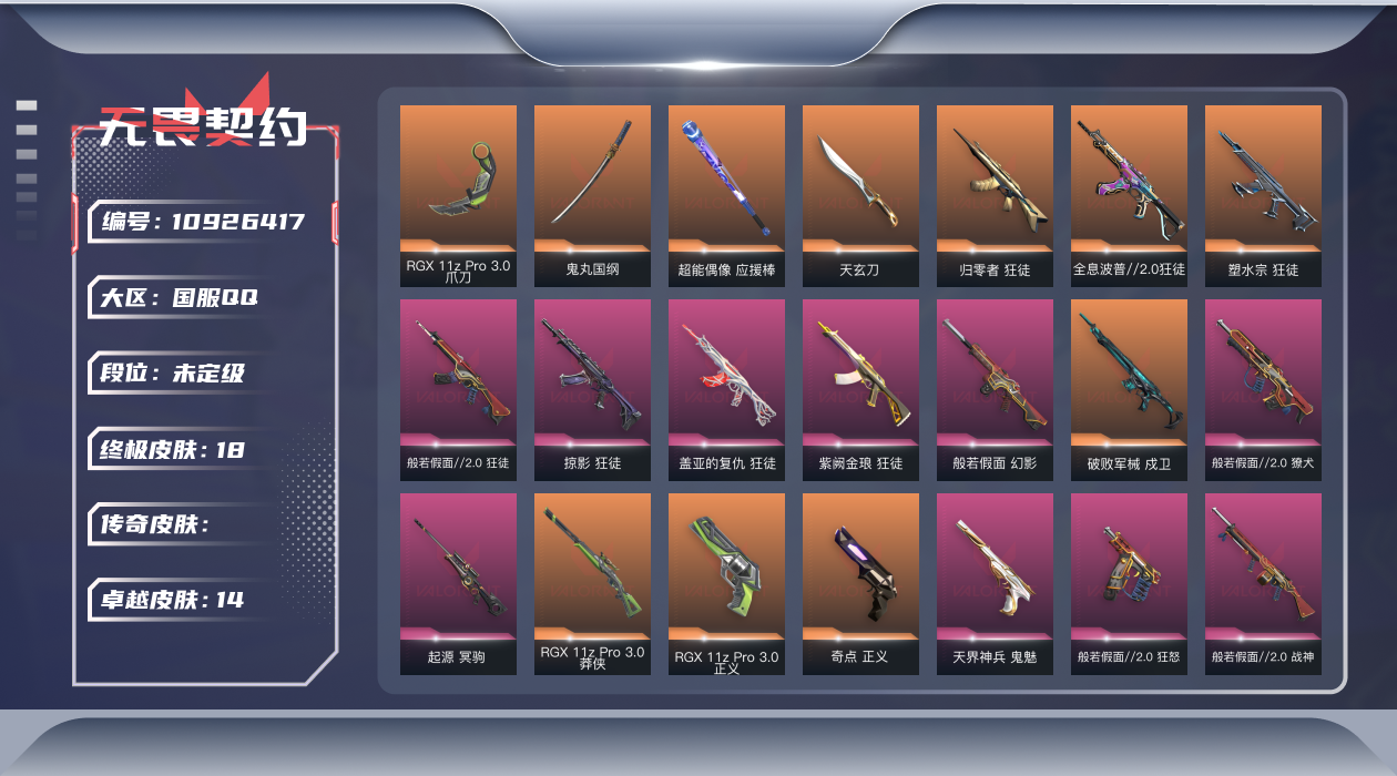 [10926417]【套装】:2022全球冠军赛套装,RGX 11z Pro//3.0套装,般若假面//2.0套装,离子武器//2.0套装 【英雄】:幻棱,炼狱,维斯,暮蝶,钛狐,壹决,铁臂,捷风,雷兹,幽影,不死鸟,贤者,猎枭,蝰蛇,零,芮娜,奇乐,尚勃勒,霓虹,斯凯,夜露,星礈,K/O,海神,盖可,黑梦,钢锁 【近战 武器】:近战武器-2022全球冠军赛 蝴蝶刀,近战武器-RGX 11z Pro//3.0 爪刀,近战武器-鬼丸国纲,近战武器-离子武器//2.0 爪刀,近战武器-超能偶像 应援棒,近战武器-天玄刀,近战武器-诡秘蛇影 军刀 【狂徒】:狂徒-归零者,狂徒-全息波普//2.0,狂徒-塑水宗,狂徒-虚空遗器,狂徒-般若假面//2.0,狂徒-掠影,狂徒-盖亚的复仇,狂徒-紫阙金琅,狂徒-离子武器//2.0,狂徒-超能偶像,狂徒-荒土机兵,狂徒-诡秘蛇影 【幻影】:幻影-2022全球冠军赛,幻影-电音光谱,幻影-般若假面,幻影-聚合之力,幻影-末日之翼,幻影-电音光谱 【戍卫】:戍卫-破败军械,戍卫-超能偶像,戍卫-浮光跃金,戍卫-逆冲蛮牛,戍卫-折光棱晶 【獠犬】:獠犬-般若假面//2.0,獠犬-采蜜小蜂队,獠犬-模拟赫兹,獠犬-逆冲蛮牛 【冥驹】:冥驹-起源,冥驹-荒土机兵,冥驹-模拟赫兹 【飞将】:飞将-聚合之力,飞将-末日之翼 【莽侠】:莽侠-RGX 11z Pro//3.0,莽侠-超限闪存,莽侠-诡秘蛇影 【战神】:战神-般若假面//2.0,战神-离子武器//2.0,战神-采蜜小蜂队,战神-浮光跃金 【奥丁】:奥丁-纳米打击,奥丁-末日之翼 【判官】:判官-超能偶像,判官-诡秘蛇影,判官-采蜜小蜂队,判官-纳米打击x 【雄鹿】:雄鹿-模拟赫兹,雄鹿-逆冲蛮牛 【骇灵】:骇灵-离子武器//2.0,骇灵-荒土机兵,骇灵-浮光跃金 【蜂刺】:蜂刺-超限闪存,蜂刺-聚合之力,蜂刺-折光棱晶 【标配】:标配-超能偶像,标配-荒土机兵,标配-浮光跃金,标配-折光棱晶 【正义】:正义-RGX 11z Pro//3.0,正义-奇点,正义-沙尘幻旅,正义-复古浪潮,正义-游戏结束 【鬼魅】:鬼魅-天界神兵,鬼魅-诡秘蛇影,鬼魅-采蜜小蜂队,鬼魅-光导纤维,鬼魅-模拟赫兹 【狂怒】:狂怒-般若假面//2.0,狂怒-离子武器//2.0,狂怒-聚合之力,狂怒-逆冲蛮牛 【短炮】:短炮-末日