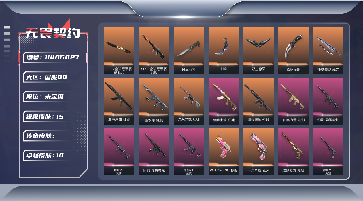 [11406027]【套装】:2022全球冠军赛套装,异鳞魔蛇套装,掠影//2.0套装 【英雄】:幻棱,炼狱,维斯,暮蝶,钛狐,壹决,铁臂,捷风,雷兹,幽影,不死鸟,贤者,猎枭,蝰蛇,芮娜,奇乐,尚勃勒,霓虹,斯凯,夜露,K/O,盖可,黑梦,钢锁 【近战 武器】:近战武器-2022全球冠军赛 蝴蝶刀,近战武器-剥皮小刀,近战武器-影钩,近战武器-双生獠牙,近战武器-诡秘蛇影 军刀,近战武器-神圣领域 战刀 【狂徒】:狂徒-混沌序曲,狂徒-塑水宗,狂徒-光荣异象,狂徒-紫阙金琅,狂徒-诡秘蛇影 【幻影】:幻影-2022全球冠军赛,幻影-黯夜怪谈,幻影-侦察力量,幻影-异鳞魔蛇,幻影-掠影//2.0,幻影-神圣领域,幻影-末日之翼 【戍卫】:戍卫-月球哨兵,戍卫-折光棱晶 【獠犬】:獠犬-神圣领域 【冥驹】:冥驹-星云暗涌 【飞将】:飞将-末日之翼 【莽侠】:莽侠-诡秘蛇影,莽侠-月球哨兵 【战神】:战神-离子武器//2.0,战神-神圣领域 【奥丁】:奥丁-掠影//2.0,奥丁-末日之翼 【判官】:判官-诡秘蛇影 【雄鹿】:雄鹿-月球哨兵 【骇灵】:骇灵-异鳞魔蛇,骇灵-掠影//2.0,骇灵-星云暗涌 【蜂刺】:蜂刺-星云暗涌,蜂刺-折光棱晶 【标配】:标配-超能偶像,标配-折光棱晶 【VCT手枪】:标配-VCT25 x FNC 【正义】:正义-千灵华绽,正义-月球哨兵 【鬼魅】:鬼魅-耀鳞威龙,鬼魅-掠影//2.0,鬼魅-诡秘蛇影,鬼魅-星云暗涌 【狂怒】:狂怒-神圣领域 【短炮】:短炮-末日之翼 【卡面】:《双城之战》拥抱 卡面,精灵大战 卡面,欢迎来到底城 卡面,南瓜盛典 卡面,修车达人 卡面,热舞环节 卡面,正义的化身 卡面,铁之华 卡面,时间到 卡面,最高舞台 卡面,声感陷阱设计图 卡面,梦幻奶茶 卡面,哨卫者之领域 卡面,瓦娃脸雪糕 卡面 ,无畏契约GO!第一卷:芮娜 卡面,无畏契约GO!第一卷:零 卡面,无垠星环 卡面,无畏契约GO!第一卷:贤者 卡面,代号红色 卡面,新兵报到 卡面,V契约 卡面,无畏契约 卡面 【喷漆】:嘭! 喷漆,都算到了 喷漆,控场勿近 喷漆,小丑猫 喷漆,熊抱 喷漆,超级粉丝 喷漆,捷风差距 喷漆,惊声尖叫 喷漆,审判之爪 喷漆,拼一枪 喷漆,买装还是存钱 喷漆,酷熊冲浪 喷漆,无畏契约GO!第一卷:芮娜 喷漆,无畏契约GO!第一卷:零 喷漆,无畏