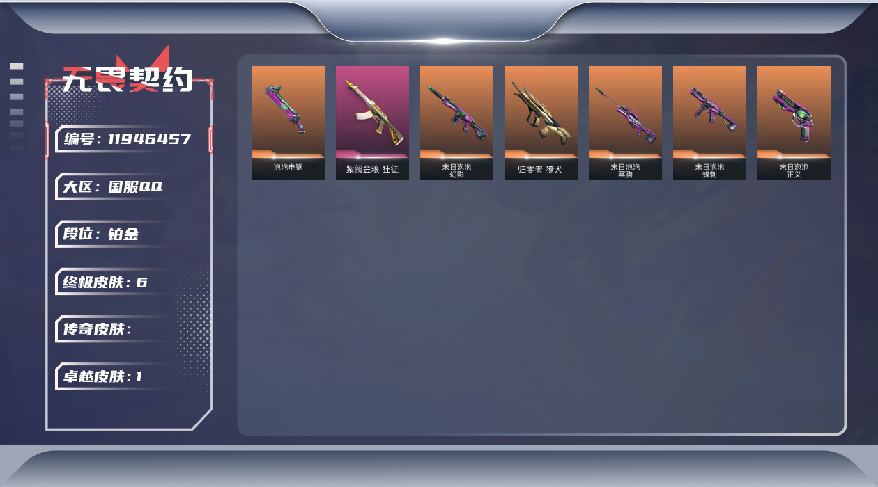 [11946457]【套装】:末日泡泡套装 【英雄】:炼狱,维斯,暮蝶,壹决,捷风,不死鸟,贤者,猎枭,芮娜,尚勃勒,霓虹 【近战 武器】:近战武器-泡泡电锯 【狂徒】:狂徒-紫阙金琅 【幻影】:幻影-末日泡泡 【獠犬】:獠犬-归零者 【冥驹】:冥驹-末日泡泡 【蜂刺】:蜂刺-末日泡泡 【正义】:正义-末日泡泡 【卡面】:树懒大作战 卡面,无畏契约GO!第一卷:芮娜 卡面,无畏契约GO!第一卷:零 卡面,代号红色 卡面,新兵报到 卡面,V契约 卡面,无畏契约 卡面 【喷漆】:买装还是存钱 喷漆,关门放狗 喷漆,无畏契约GO!第一卷:捷风 喷漆,胜利属于无畏契约 喷漆,GLHF 喷漆,无畏契约 喷漆 【挂饰】:无畏契约 纪念币 挂饰