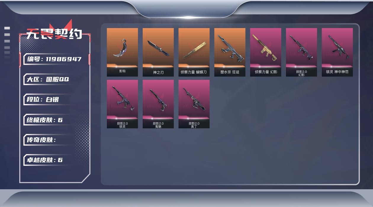 [11986947]【套装】:掠影//2.0套装 【英雄】:炼狱,维斯,暮蝶,壹决,捷风,雷兹,幽影,不死鸟,贤者,猎枭,芮娜,奇乐,尚勃勒,夜露,盖可,黑梦 【近战 武器】:近战武器-影钩,近战武器-神之刃,近战武器-侦察力量 蝴蝶刀 【狂徒】:狂徒-塑水宗 【幻影】:幻影-侦察力量,幻影-掠影//2.0 【奥丁】:奥丁-掠影//2.0 【骇灵】:骇灵-神中神罚,骇灵-掠影//2.0 【鬼魅】:鬼魅-掠影//2.0 【卡面】:红鳞松叶 卡面,无畏契约GO!第一卷:零 卡面,《双城之战》金克丝 卡面,暗枪 卡面,代号红色 卡面,新兵报到 卡面,V契约 卡面,无畏契约 卡面 【喷漆】:情绪控制 喷漆,买装还是存钱 喷漆,胜利属于无畏契约 喷漆,GLHF 喷漆,无畏契约 喷漆 【挂饰】:无畏契约 纪念币 挂饰