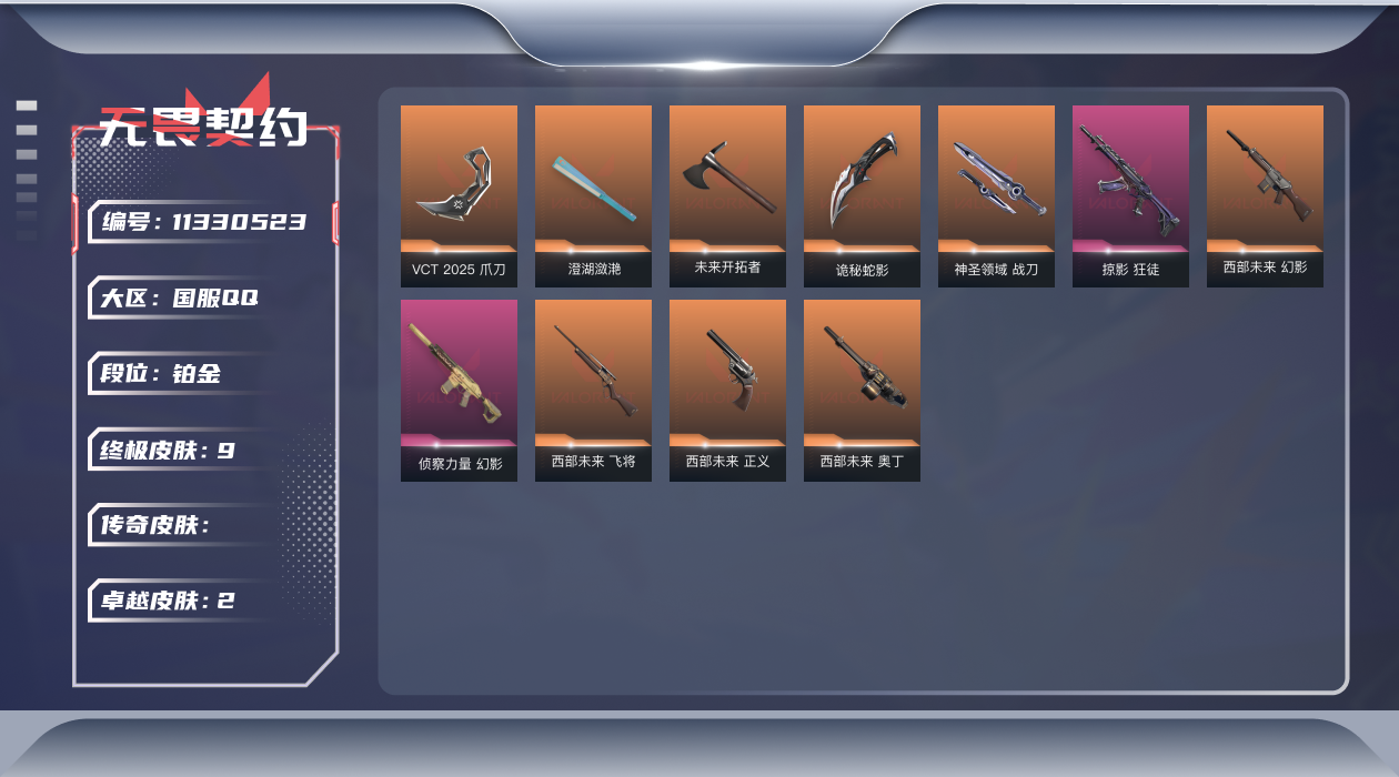 [11330523]【套装】:西部未来套装,VCT 2025 赛季套装 【英雄】:幻棱,炼狱,暮蝶,壹决,铁臂,捷风,雷兹,幽影,不死鸟,贤者,猎枭,蝰蛇,零,芮娜,奇乐,尚勃勒,霓虹,斯凯,夜露,星礈,K/O,盖可,黑梦 【近战 武器】:近战武器-VCT 2025 爪刀,近战武器-澄湖潋滟,近战武器-未来开拓者,近战武器-诡秘蛇影 军刀,近战武器-神圣领域 战刀 【狂徒】:狂徒-掠影,狂徒-诡秘蛇影 【幻影】:幻影-西部未来,幻影-侦察力量,幻影-神圣领域,幻影-末日之翼,幻影-西部未来 【戍卫】:戍卫-月球哨兵,戍卫-折光棱晶 【獠犬】:獠犬-神圣领域 【冥驹】:冥驹-星云暗涌 【飞将】:飞将-西部未来,飞将-末日之翼 【莽侠】:莽侠-诡秘蛇影,莽侠-月球哨兵 【战神】:战神-神圣领域 【奥丁】:奥丁-西部未来,奥丁-末日之翼 【判官】:判官-诡秘蛇影 【雄鹿】:雄鹿-月球哨兵 【骇灵】:骇灵-星云暗涌 【蜂刺】:蜂刺-星云暗涌,蜂刺-折光棱晶 【标配】:标配-折光棱晶 【正义】:正义-西部未来,正义-月球哨兵 【鬼魅】:鬼魅-诡秘蛇影,鬼魅-星云暗涌 【狂怒】:狂怒-神圣领域 【短炮】:短炮-末日之翼 【卡面】:铁之华 卡面,无畏契约GO!第一卷:芮娜 卡面,无畏契约GO!第一卷:零 卡面,无畏契约GO!第一卷:贤者 卡面,势不可挡//K/O 卡面,代号红色 卡面,新兵报到 卡面,V契约 卡面,无畏契约 卡面 【喷漆】:买装还是存钱 喷漆,关门放狗 喷漆,无畏契约GO!第一卷:芮娜 喷漆,暴走萝莉 喷漆,胜利属于无畏契约 喷漆,GLHF 喷漆,无畏契约 喷漆 【挂饰】:天外飞客 挂饰,《双城之战》魄罗 挂饰,无畏契约 纪念币 挂饰