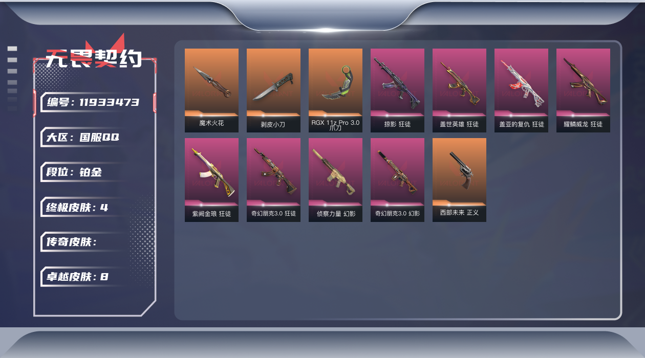[11933473]【英雄】:幻棱,炼狱,维斯,暮蝶,钛狐,壹决,铁臂,捷风,雷兹,幽影,不死鸟,贤者,猎枭,零,芮娜,尚勃勒,霓虹,斯凯,夜露,盖可,钢锁 【近战 武器】:近战武器-魔术火花,近战武器-剥皮小刀,近战武器-RGX 11z Pro//3.0 爪刀,近战武器-魔术火花 【狂徒】:狂徒-掠影,狂徒-盖世英雄,狂徒-盖亚的复仇,狂徒-耀鳞威龙,狂徒-紫阙金琅,狂徒-奇幻朋克//3.0 【幻影】:幻影-侦察力量,幻影-奇幻朋克//3.0 【标配】:标配-超能偶像 【正义】:正义-西部未来,正义-超限闪存,正义-复古浪潮,正义-纳米打击 【鬼魅】:鬼魅-诡秘蛇影,鬼魅-光导纤维,鬼魅-灵魂消声者,鬼魅-星云暗涌 【卡面】:终章:激斗汉堡 卡面,进入射程 卡面,纳米打击 卡面,《双城之战》拥抱 卡面,精灵大战 卡面,欢迎来到底城 卡面,南瓜盛典 卡面,修车达人 卡面,正义的化身 卡面,终章:生意人麦宝 卡面,铁之华 卡面,时间到 卡面,最高舞台 卡面,声感陷阱设计图 卡面,梦幻奶茶 卡面,源能反应 卡面,暂别喧嚣 卡面,零点嗅探设计图 卡面,终章:瓦娃脸雪糕 卡面,表象之下 卡面,沙雕爆能器 卡面,无畏契约GO!第一卷:芮娜 卡面,清除名单 卡面,无畏契约GO!第一卷:零 卡面,终章:同步耍酷 卡面,龍记 卡面,化茧成蝶 卡面,完美调谐 卡面 ,暗枪 卡面,夯实根基 卡面,"Luie" 卡面,铁臂设计图 卡面,代号红色 卡面,新兵报到 卡面,V契约 卡面,无畏契约 卡面 【喷漆】:嗨宝南瓜灯 喷漆,嘭! 喷漆,都算到了 喷漆,控场勿近 喷漆,小丑猫 喷漆,熊抱 喷漆,超级粉丝 喷漆,捷风差距 喷漆,惊声尖叫 喷漆,拼一枪 喷漆,我觉得不行 喷漆,我的刀呢? 喷漆,UWU 喷漆,新潮流 喷漆,双击点赞 喷漆,买装还是存钱 喷漆,醒狮贺春 喷漆,旅行小熊 喷漆,蕊形灯 喷漆,真相只有一个 喷漆,再吃最后一口 喷漆,老铁困了 喷漆,胜利属于无畏契约 喷漆,GLHF 喷漆,无畏契约 喷漆 【挂饰】:终章:猫猫木乃伊 挂饰,悠闲鸡块 挂饰,伞绳 挂饰,《双城之战》小蛋糕 挂饰,第九季//第三幕 纪念币 挂饰,工具腰带 挂饰,无畏契约GO!第一卷 芮娜 挂饰,无畏契约GO!第一卷 零 挂饰,熔岩灯 挂饰,第九季//第二幕 纪念币 挂饰,终章:这瓜保熟 挂饰,糖葫芦 挂饰,袖珍捷风 挂饰,迷你