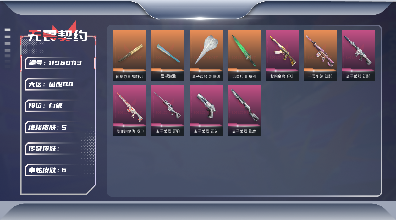[11960113]【套装】:离子武器套装 【英雄】:幻棱,炼狱,维斯,暮蝶,钛狐,壹决,铁臂,捷风,雷兹,幽影,不死鸟,贤者,猎枭,蝰蛇,零,芮娜,奇乐,尚勃勒,霓虹,斯凯,K/O,盖可,黑梦 【近战 武器】:近战武器-侦察力量 蝴蝶刀,近战武器-澄湖潋滟,近战武器-离子武器 能量剑,近战武器-流星兵团 短剑 【狂徒】:狂徒-紫阙金琅,狂徒-流星兵团 【幻影】:幻影-千灵华绽,幻影-离子武器 【戍卫】:戍卫-盖亚的复仇,戍卫-战术熊与伙伴们 【冥驹】:冥驹-离子武器 【飞将】:飞将-战术熊与伙伴们 【莽侠】:莽侠-纤云弄巧 【奥丁】:奥丁-流星兵团 【雄鹿】:雄鹿-离子武器 【骇灵】:骇灵-流星兵团 【蜂刺】:蜂刺-纤云弄巧 【标配】:标配-超能偶像,标配-战术熊与伙伴们 【正义】:正义-离子武器,正义-纤云弄巧 【鬼魅】:鬼魅-流星兵团 【狂怒】:狂怒-战术熊与伙伴们 【短炮】:短炮-纤云弄巧 【卡面】:《双城之战》拥抱 卡面,精灵大战 卡面,欢迎来到底城 卡面,南瓜盛典 卡面,无畏契约:暮蝶 卡面,修车达人 卡面,正义的化身 卡面,终章:生意人麦宝 卡面,铁之华 卡面,时间到 卡面,最高舞台 卡面,声感陷阱设计图 卡面,梦幻奶茶 卡面,终章:打造专属狂徒 卡面,趁热吃 卡面,西装暴徒 卡面,失控边缘 卡面,哨卫者之领域 卡面,暮蝶工牌 卡面,战术熊与伙伴们 卡面,源能反应 卡面,流星兵团 卡面,纤云弄巧 卡面,暂别喧嚣 卡面,打造专属狂徒 卡面,零点嗅探设计图 卡面,无畏契约GO!第一卷:芮娜 卡面,清除名单 卡面,无畏契约GO!第一卷:零 卡面,代号红色 卡面,新兵报到 卡面,V契约 卡面,无畏契约 卡面 【喷漆】:嘭! 喷漆,都算到了 喷漆,控场勿近 喷漆,伤心心 喷漆,熊抱 喷漆,超级粉丝 喷漆,捷风差距 喷漆,惊声尖叫 喷漆,2021冠军巡回赛花火 喷漆,拼一枪 喷漆,加油!加油! 喷漆,开心到爆炸 喷漆,皮蛋萌舞 喷漆,我觉得不行 喷漆,头号粉丝 喷漆,吸一口快乐 喷漆,永远的答案 喷漆,再来一次? 喷漆,别挡我的路! 喷漆,我的刀呢? 喷漆,当然可以 喷漆,流星兵团 喷漆,战术熊与伙伴们 喷漆,禁止喷漆 喷漆,纤云弄巧 喷漆,双击点赞 喷漆,买装还是存钱 喷漆,胜利属于无畏契约 喷漆,GLHF 喷漆,无畏契约 喷漆 【挂饰】:《双城之战》小蛋糕 挂饰,第九季//第三