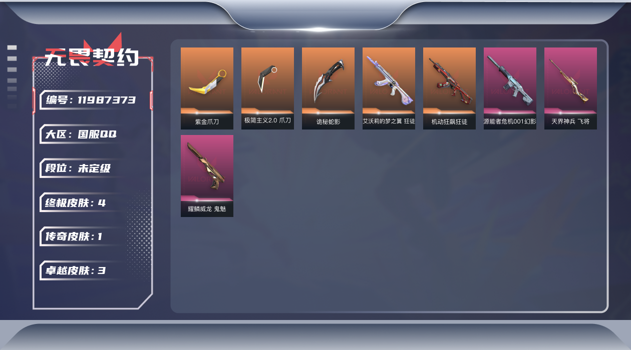 [11987373]【英雄】:幻棱,炼狱,暮蝶,壹决,捷风,不死鸟,贤者,猎枭,芮娜,斯凯,盖可 【近战 武器】:近战武器-紫金爪刀,近战武器-极简主义//2.0 爪刀,近战武器-诡秘蛇影 军刀 【狂徒】:狂徒-艾沃莉的梦之翼,狂徒-机动狂飙,狂徒-诡秘蛇影 【幻影】:幻影-源能者危机001,幻影-末日之翼 【戍卫】:戍卫-折光棱晶 【飞将】:飞将-天界神兵,飞将-末日之翼 【莽侠】:莽侠-诡秘蛇影 【奥丁】:奥丁-末日之翼 【判官】:判官-诡秘蛇影 【蜂刺】:蜂刺-折光棱晶 【标配】:标配-折光棱晶,标配-樱花 【鬼魅】:鬼魅-耀鳞威龙,鬼魅-诡秘蛇影 【短炮】:短炮-末日之翼 【卡面】:红鳞松叶 卡面,梦幻奶茶 卡面,无畏契约GO!第一卷:零 卡面,代号红色 卡面,新兵报到 卡面,V契约 卡面,无畏契约 卡面 【喷漆】:捷风差距 喷漆,买装还是存钱 喷漆,胜利属于无畏契约 喷漆,GLHF 喷漆,无畏契约 喷漆 【挂饰】:迷你机甲 挂饰,传世莲华 挂饰,天外飞客 挂饰,无畏契约 纪念币 挂饰