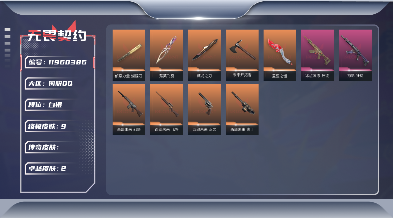 [11960386]【套装】:西部未来套装 【英雄】:幻棱,炼狱,维斯,暮蝶,钛狐,壹决,铁臂,捷风,雷兹,幽影,不死鸟,贤者,猎枭,零,芮娜,奇乐,尚勃勒,霓虹,斯凯,夜露,星礈,K/O,海神,盖可,黑梦 【近战 武器】:近战武器-侦察力量 蝴蝶刀,近战武器-落英飞旋,近战武器-威龙之刃,近战武器-未来开拓者,近战武器-盖亚之愠 【狂徒】:狂徒-冰点凝冻,狂徒-掠影,狂徒-彩虹魔力小白马 【幻影】:幻影-西部未来,幻影-红鳞松叶,幻影-西部未来 【飞将】:飞将-西部未来 【奥丁】:奥丁-西部未来 【雄鹿】:雄鹿-漫天彩霞 【骇灵】:骇灵-晶态集成 【正义】:正义-西部未来,正义-超限闪存 【卡面】:《双城之战》拥抱 卡面,欢迎来到底城 卡面,南瓜盛典 卡面,修车达人 卡面,正义的化身 卡面,时间到 卡面,最高舞台 卡面,声感陷阱设计图 卡面,梦幻奶茶 卡面,源能反应 卡面,零点嗅探设计图 卡面,沙雕爆能器 卡面,无畏契约GO!第一卷:芮娜 卡面,清除名单 卡面,无畏契约GO!第一卷:零 卡面,龍记 卡面,完美调谐 卡面 ,暗枪 卡面,夯实根基 卡面,"Luie" 卡面,热烈欢迎 卡面,铁臂设计图 卡面,代号红色 卡面,新兵报到 卡面,V契约 卡面,无畏契约 卡面 【喷漆】:嘭! 喷漆,都算到了 喷漆,控场勿近 喷漆,小丑猫 喷漆,熊抱 喷漆,超级粉丝 喷漆,捷风差距 喷漆,惊声尖叫 喷漆,拼一枪 喷漆,我的刀呢? 喷漆,新潮流 喷漆,双击点赞 喷漆,买装还是存钱 喷漆,醒狮贺春 喷漆,旅行小熊 喷漆,蕊形灯 喷漆,老铁困了 喷漆,口袋贤者 喷漆,胜利属于无畏契约 喷漆,GLHF 喷漆,无畏契约 喷漆 【挂饰】:《双城之战》小蛋糕 挂饰,第九季//第三幕 纪念币 挂饰,工具腰带 挂饰,熔岩灯 挂饰,第九季//第二幕 纪念币 挂饰,糖葫芦 挂饰,袖珍捷风 挂饰,迷你浓缩 挂饰,Z世代特饮 挂饰,第九季//第一幕 纪念币 挂饰,荧光棒 挂饰,第八季//第三幕 纪念币 挂饰,传世莲华 挂饰,第八季//第二幕 纪念币 挂饰 ,天外飞客 挂饰,好运福爪 挂饰,瞄这里 挂饰,第八季//第一幕 纪念币 挂饰,第七季//第三幕 纪念币 挂饰,幸运中国结 挂饰,无畏契约 纪念币 挂饰