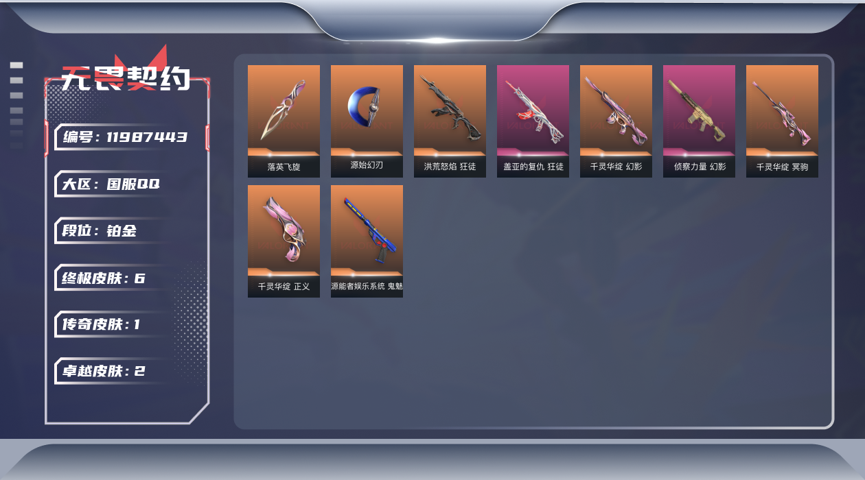 [11987443]【英雄】:炼狱,维斯,暮蝶,壹决,铁臂,捷风,雷兹,幽影,不死鸟,贤者,猎枭,蝰蛇,零,芮娜,奇乐,尚勃勒,霓虹,盖可,黑梦,钢锁 【近战 武器】:近战武器-落英飞旋,近战武器-源始幻刃 【狂徒】:狂徒-洪荒怒焰,狂徒-盖亚的复仇,狂徒-超能偶像 【幻影】:幻影-千灵华绽,幻影-侦察力量 【戍卫】:戍卫-战术熊与伙伴们 【冥驹】:冥驹-千灵华绽 【飞将】:飞将-聚合之力,飞将-战术熊与伙伴们 【莽侠】:莽侠-纤云弄巧 【战神】:战神-采蜜小蜂队 【奥丁】:奥丁-流星兵团 【判官】:判官-超能偶像,判官-采蜜小蜂队 【骇灵】:骇灵-流星兵团 【蜂刺】:蜂刺-聚合之力,蜂刺-纤云弄巧 【标配】:标配-战术熊与伙伴们 【正义】:正义-千灵华绽,正义-纤云弄巧 【鬼魅】:鬼魅-源能者娱乐系统,鬼魅-采蜜小蜂队 【狂怒】:狂怒-聚合之力,狂怒-战术熊与伙伴们 【短炮】:短炮-纤云弄巧 【卡面】:《双城之战》拥抱 卡面,欢迎来到底城 卡面,南瓜盛典 卡面,VCT CN首冠 卡面,正义的化身 卡面,时间到 卡面,最高舞台 卡面,超能偶像 卡面,生意人麦宝 卡面,声感陷阱设计图 卡面,钢锁工牌 卡面,战术小伙伴的夏日 卡面,采蜜小蜂队 卡面,聚合之力 卡面,梦幻奶茶 卡面,哨卫者之领域 卡面,暮蝶工牌 卡面,战术熊与伙伴们 卡面,源能反应 卡面,流星兵团 卡面,纤云弄巧 卡面,暂别喧嚣 卡面,打造专属狂徒 卡面,零点嗅探设计图 卡面,沙雕爆能器 卡面,清除名单 卡面,龍记 卡面,完美调谐 卡面 ,暗枪 卡面,天台狂欢 卡面,代号红色 卡面,新兵报到 卡面,V契约 卡面,无畏契约 卡面 【喷漆】:嘭! 喷漆,都算到了 喷漆,熊抱 喷漆,蛋糕还是爆能器? 喷漆,超级粉丝 喷漆,捷风差距 喷漆,超能偶像 喷漆,放我出去 喷漆,审判之爪 喷漆,掩护我 喷漆,大佬发枪 喷漆,边缘试探 喷漆,拼一枪 喷漆,聚合之力 喷漆,采蜜小蜂队 喷漆,梦幻小队 喷漆,五个全都齐了 喷漆,我觉得不行 喷漆,头号粉丝 喷漆,吸一口快乐 喷漆,永远的答案 喷漆,再来一次? 喷漆,别挡我的路! 喷漆,我的刀呢? 喷漆,当然可以 喷漆,流星兵团 喷漆,战术熊与伙伴们 喷漆,禁止喷漆 喷漆,纤云弄巧 喷漆,双击点赞 喷漆,醒狮贺春 喷漆,蕊形灯 喷漆,胜利属于无畏契约 喷漆,GLHF 喷漆,无畏契约 喷漆 【挂饰】