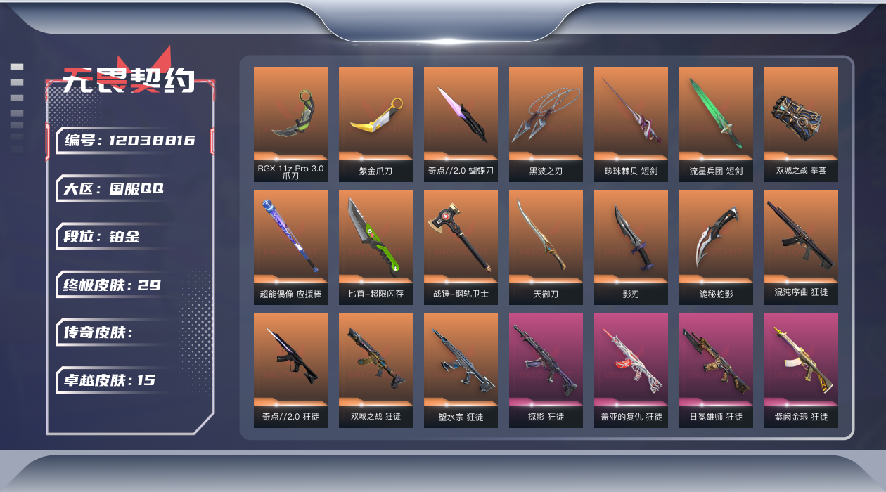 [12038816]皮肤资产价值66850、已使用R点1390/号里带2253点券【套装】:《双城之战》收藏套装,塑水宗套装,RGX 11z Pro//3.0套装,奇点//2.0套装,VCTxEDG 队伍套装,掠影套装,天界神兵//2.0套装 【英雄】:幻棱,炼狱,维斯,暮蝶,钛狐,壹决,铁臂,捷风,雷兹,幽影,不死鸟,贤者,猎枭,蝰蛇,零,芮娜,奇乐,尚勃勒,霓虹,斯凯,夜露,星礈,K/O,海神,盖可,黑梦,钢锁 【近战 武器】:近战武器-RGX 11z Pro//3.0 爪刀,近战武器-紫金爪刀,近战武器-奇点//2.0 蝴蝶刀,近战武器-黑波之刃,近战武器-珍珠棘贝 短剑,近战武器-流星兵团 短剑,近战武器-双城之战 拳套,近战武器-超能偶像 应援棒,近战武器-超限闪存 匕首,近战武器-钢轨卫士 战锤,近战武器-天御刀,近战武器-影刃,近战武器-诡秘蛇影 军刀 【狂徒】:狂徒-混沌序曲,狂徒-奇点//2.0,狂徒-双城之战,狂徒-塑水宗,狂徒-掠影,狂徒-盖亚的复仇,狂徒-日冕雄师,狂徒-紫阙金琅,狂徒-超能偶像,狂徒-钢轨卫士,狂徒-流星兵团,狂徒-诡秘蛇影 【幻影】:幻影-天界神兵//2.0,幻影-侦察力量,幻影-超限闪存,幻影-珍珠棘贝,幻影-聚合之力,幻影-战术小伙伴,幻影-末日之翼 【戍卫】:戍卫-掠影,戍卫-超能偶像,戍卫-钢轨卫士,戍卫-珍珠棘贝,戍卫-浮光跃金,戍卫-战术熊与伙伴们,戍卫-折光棱晶 【獠犬】:獠犬-归零者,獠犬-采蜜小蜂队,獠犬-复古浪潮,獠犬-模拟赫兹,獠犬-逆冲蛮牛,獠犬-战术小伙伴 【冥驹】:冥驹-全息波普//2.0,冥驹-掠影,冥驹-荒土机兵,冥驹-复古浪潮,冥驹-模拟赫兹 【飞将】:飞将-塑水宗,飞将-聚合之力,飞将-光导纤维,飞将-战术熊与伙伴们,飞将-末日之翼 【莽侠】:莽侠-RGX 11z Pro//3.0,莽侠-超限闪存,莽侠-诡秘蛇影,莽侠-深海水族,莽侠-纤云弄巧 【战神】:战神-奇点,战神-采蜜小蜂队,战神-浮光跃金,战神-深海水族 【奥丁】:奥丁-天界神兵//2.0,奥丁-流星兵团,奥丁-纳米打击,奥丁-战术小伙伴,奥丁-末日之翼 【判官】:判官-天界神兵//2.0,判官-超能偶像,判官-诡秘蛇影,判官-采蜜小蜂队,判官-纳米打击x 【雄鹿】:雄鹿-紫阙金琅//2.0,雄鹿-复古浪潮,雄鹿-模拟赫兹,雄鹿-逆冲蛮牛 【骇