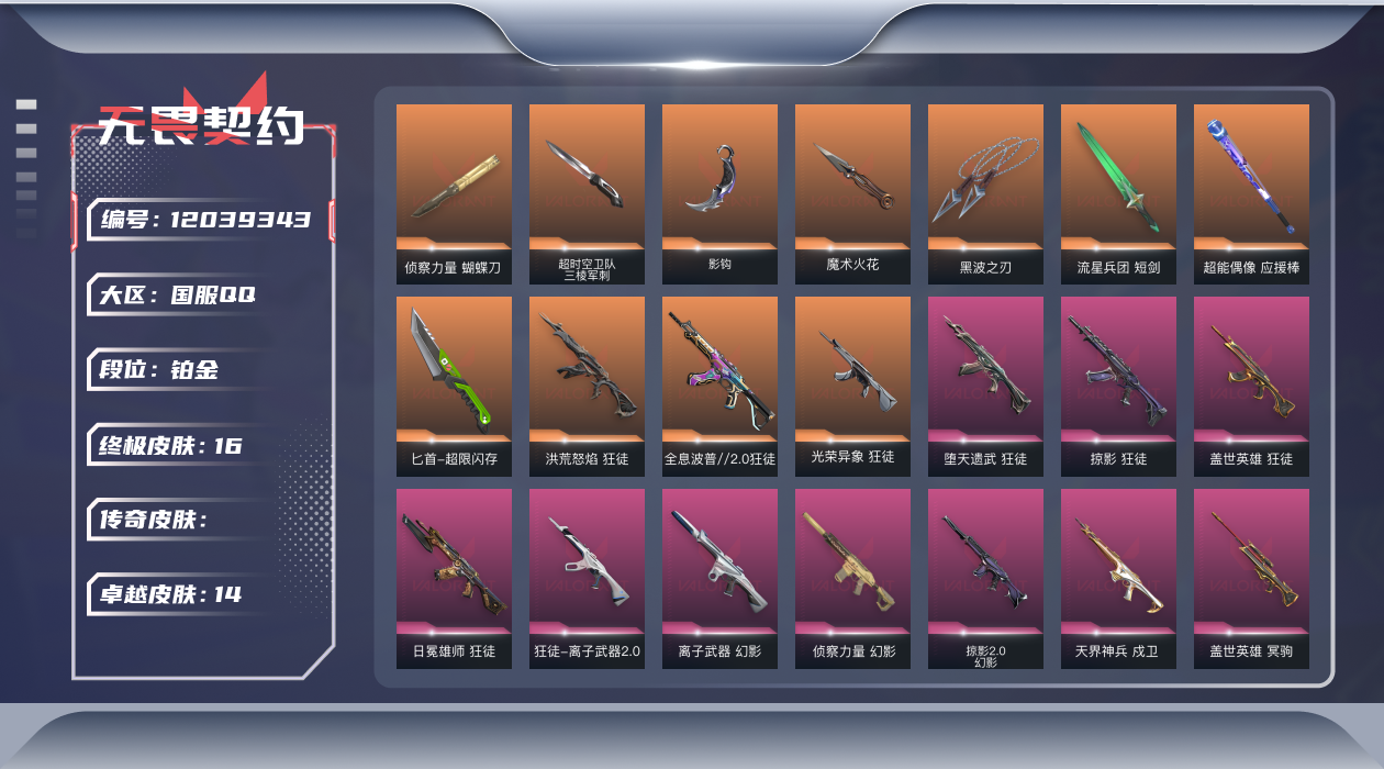 [12039343]皮肤资产价值45790 【套装】:掠影//2.0套装 【英雄】:幻棱,炼狱,维斯,暮蝶,钛狐,壹决,铁臂,捷风,雷兹,幽影,不死鸟,贤者,猎枭,蝰蛇,零,芮娜,奇乐,尚勃勒,霓虹,斯凯,夜露,星礈,K/O,海神,盖可,黑梦,钢锁 【近战 武器】:近战武器-侦察力量 蝴蝶刀,近战武器-超时空卫队 三棱军刺,近战武器-影钩,近战武器-魔术火花,近战武器-黑波之刃,近战武器-流星兵团 短剑,近战武器-超能偶像 应援棒,近战武器-超限闪存 匕首,近战武器-魔术火花 【狂徒】:狂徒-洪荒怒焰,狂徒-全息波普//2.0,狂徒-光荣异象,狂徒-堕天遗武,狂徒-掠影,狂徒-盖世英雄,狂徒-日冕雄师,狂徒-离子武器//2.0,狂徒-超能偶像,狂徒-流星兵团 【幻影】:幻影-离子武器,幻影-侦察力量,幻影-掠影//2.0,幻影-超限闪存,幻影-聚合之力 【戍卫】:戍卫-天界神兵,戍卫-超能偶像,戍卫-浮光跃金,戍卫-战术熊与伙伴们 【獠犬】:獠犬-采蜜小蜂队,獠犬-模拟赫兹 【冥驹】:冥驹-盖世英雄,冥驹-模拟赫兹 【飞将】:飞将-聚合之力,飞将-战术熊与伙伴们 【莽侠】:莽侠-RGX 11z Pro//3.0,莽侠-超限闪存,莽侠-纤云弄巧 【战神】:战神-采蜜小蜂队,战神-浮光跃金 【奥丁】:奥丁-掠影//2.0,奥丁-流星兵团 【判官】:判官-超能偶像,判官-采蜜小蜂队 【雄鹿】:雄鹿-模拟赫兹 【骇灵】:骇灵-掠影//2.0,骇灵-流星兵团,骇灵-浮光跃金 【蜂刺】:蜂刺-超限闪存,蜂刺-聚合之力,蜂刺-纤云弄巧 【标配】:标配-超能偶像,标配-浮光跃金,标配-战术熊与伙伴们 【正义】:正义-奇点,正义-塑水宗,正义-超限闪存,正义-传奇制造,正义-复古浪潮,正义-纳米打击,正义-纤云弄巧 【鬼魅】:鬼魅-破败军械,鬼魅-天界神兵,鬼魅-掠影//2.0,鬼魅-流星兵团,鬼魅-诡秘蛇影,鬼魅-采蜜小蜂队,鬼魅-模拟赫兹,鬼魅-星云暗涌 【狂怒】:狂怒-聚合之力,狂怒-战术熊与伙伴们 【短炮】:短炮-纤云弄巧 【卡面】:终章:激斗汉堡 卡面,进入射程 卡面,激斗汉堡 卡面,《双城之战》拥抱 卡面,精灵大战 卡面,欢迎来到底城 卡面,南瓜盛典 卡面,唱片的故事 卡面,钢弓与箭弦 卡面,排除故障 卡面,战术桌游 卡面,悠享食光 卡面,修车达人 卡面,模拟赫兹 卡面,浮光跃金 卡面,超