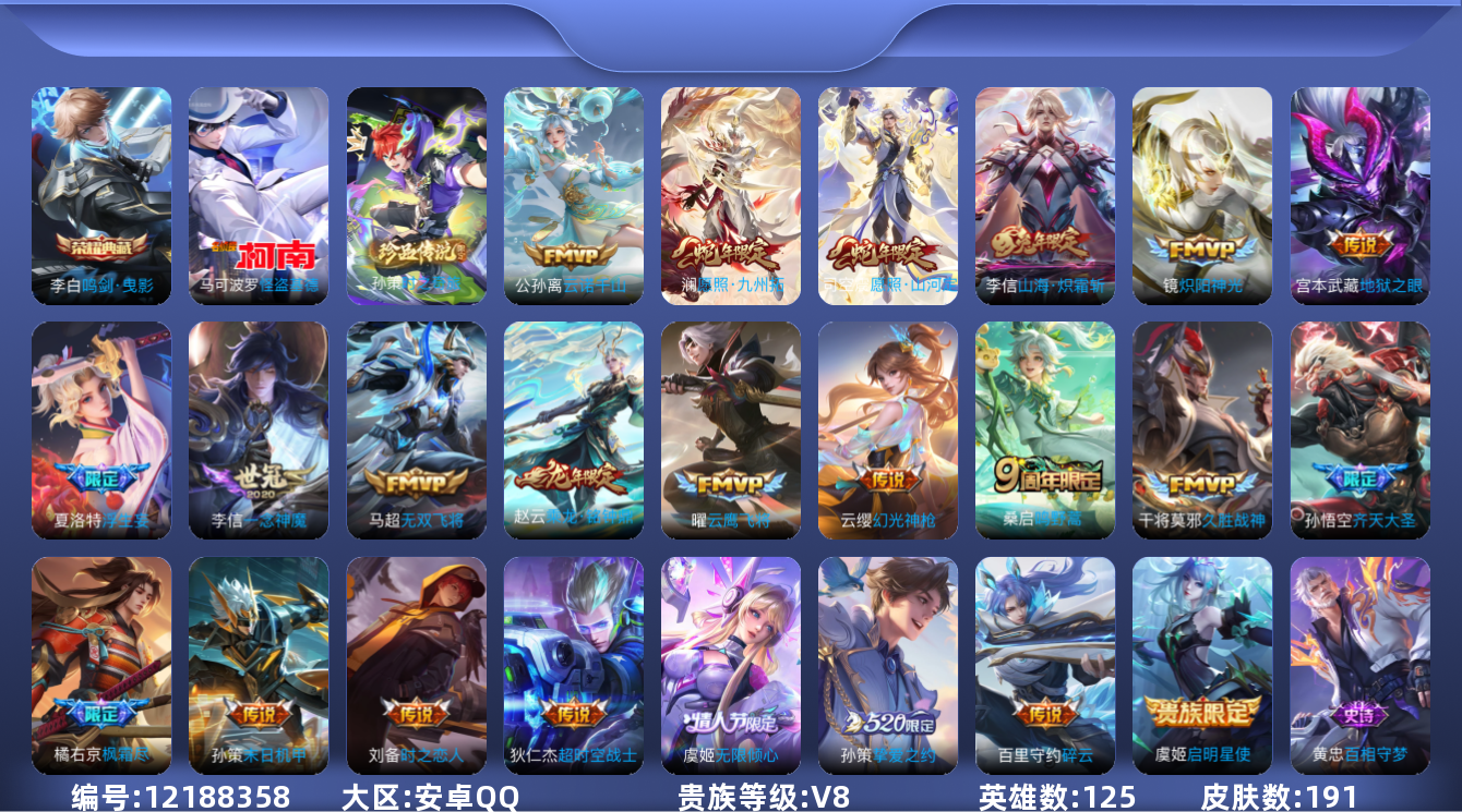 [12188358]【商品标题】:安卓Q-V8-最强王者段位-125英雄-191皮肤-1典藏-0珍品无双-0无双-2珍品传说-23传说-62史诗
