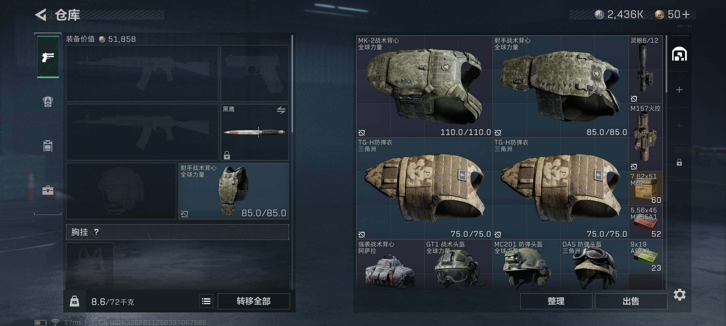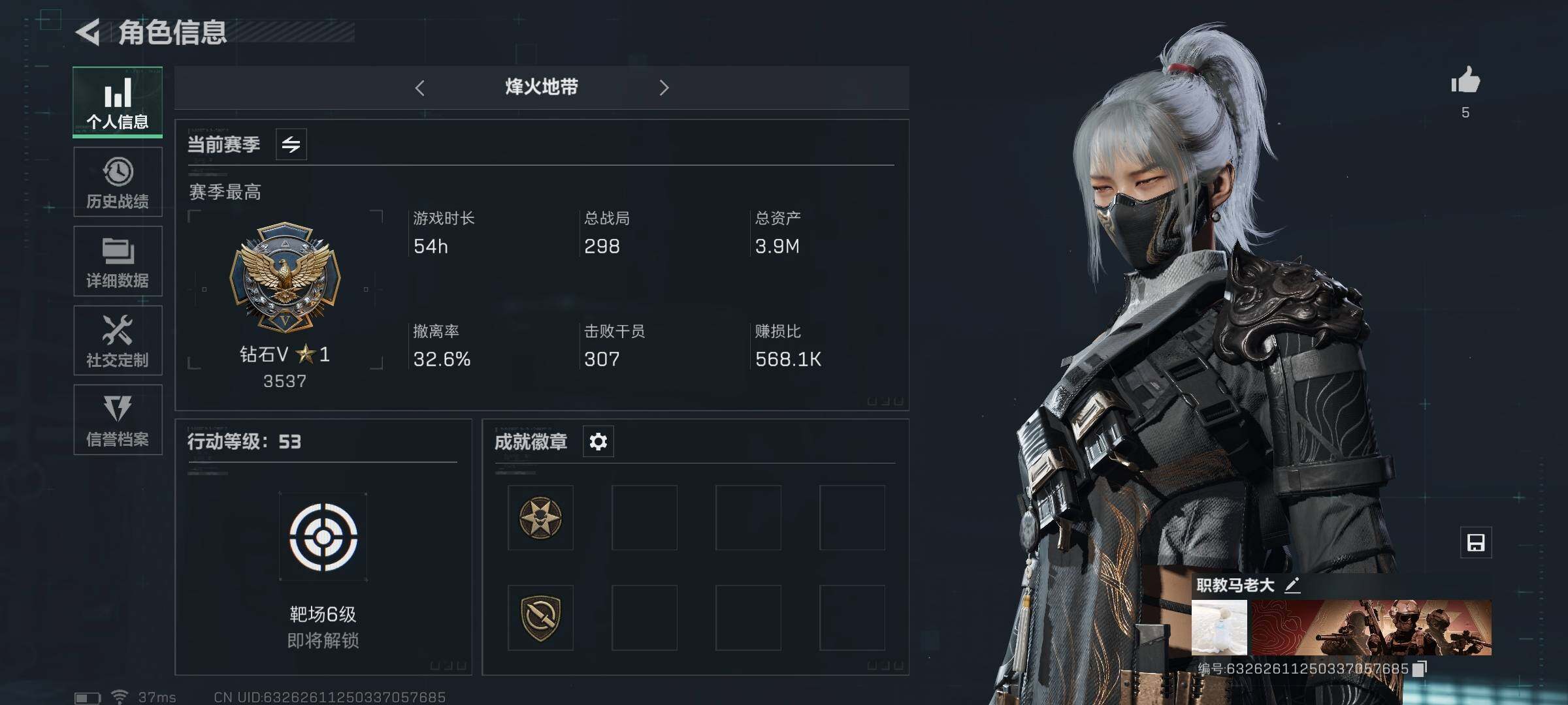 - [11881937]总资产:99.5M 2干员外观 1近战传说 13传说枪械 哈夫币:681.212K 可二次 可修改实名 优质装备:近战-北极星,Vector冲锋枪-美杜莎 烽火地带段位:钻石 全面战场段位:无段位 传说武器皮肤:SR-25射手步枪-水墨云图,AS Val突击步枪-蛇年祥瑞,SMG45冲锋枪-骑士,复合弓-黑-天际线,K437突击步枪-北极星,QCQ171冲锋枪-北极星,725双管霰弹枪-送葬人-无题密令,CAR-15突击步枪-阿米娅,AK-12突击步枪-夜鹰,M4A1突击步枪-蚀金玫瑰,CAR-15突击步枪-黑鹰坠落 史诗武器皮肤:M1014霰弹枪-潜袭者,SR-3M紧凑突击步枪-英雄,SR-25射手步枪-战场英杰,PKM通用机枪-蝮蛇,AUG突击步枪-蝮蛇,M700狙击步枪-蝮蛇,G3战斗步枪-战场英杰,SG552突击步枪-尖端治疗,M1014霰弹枪-林中猎手,P90冲锋枪-暗影猎手,PKM通用机枪-守夜人,AS Val突击步枪-尖端治疗,M700狙击步枪-守夜人,Ash-12战斗步枪-守夜人,SR-25射手步枪-尖端治疗,MP5冲锋枪-深海恐惧,勇士冲锋枪-深海恐惧,SG552突击步枪-深海恐惧,AKM突击步枪-林中猎手,M16A4突击步枪-竞赛选手,M250通用机枪-囚徒,SV-98狙击步枪-林中猎手,PSG-1射手步枪-无垢,PKM通用机枪-荒野求生,QBZ95-1突击步枪-曙光,沙漠之鹰-曙光,Vector冲锋枪-阿萨拉文明,SVD狙击步枪-阿萨拉工艺,S12K霰弹枪-曙光,PKM通用机枪-英雄,M700狙击步枪-竞技风,QSZ92G-风林火山,93R-博士 干员外观:红狼-蚀金玫瑰,威龙-飞虎