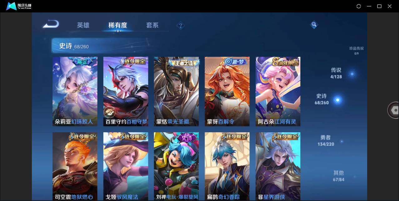 - PX_2108269-实名: 不可修改 英雄数: 124 皮肤数: 262 荣耀水晶: 武则天,星空梦想,无限飓风号,鸣剑·曳影,全息碎影 传说皮: 黄金狮子座,黄金射手座,冠军飞将,绛天战甲,久胜战神,一念神魔,云霓雀翎,末日机甲-孙尚香,地狱火,仲夏夜之梦,海洋之心,李逍遥,游龙清影,无双飞将,山海·炽霜斩 限定皮: 李小龙,梁祝,引擎之心,烈魂,岱宗,神威,蜜橘之夏,太华,天狼征服者,青春决