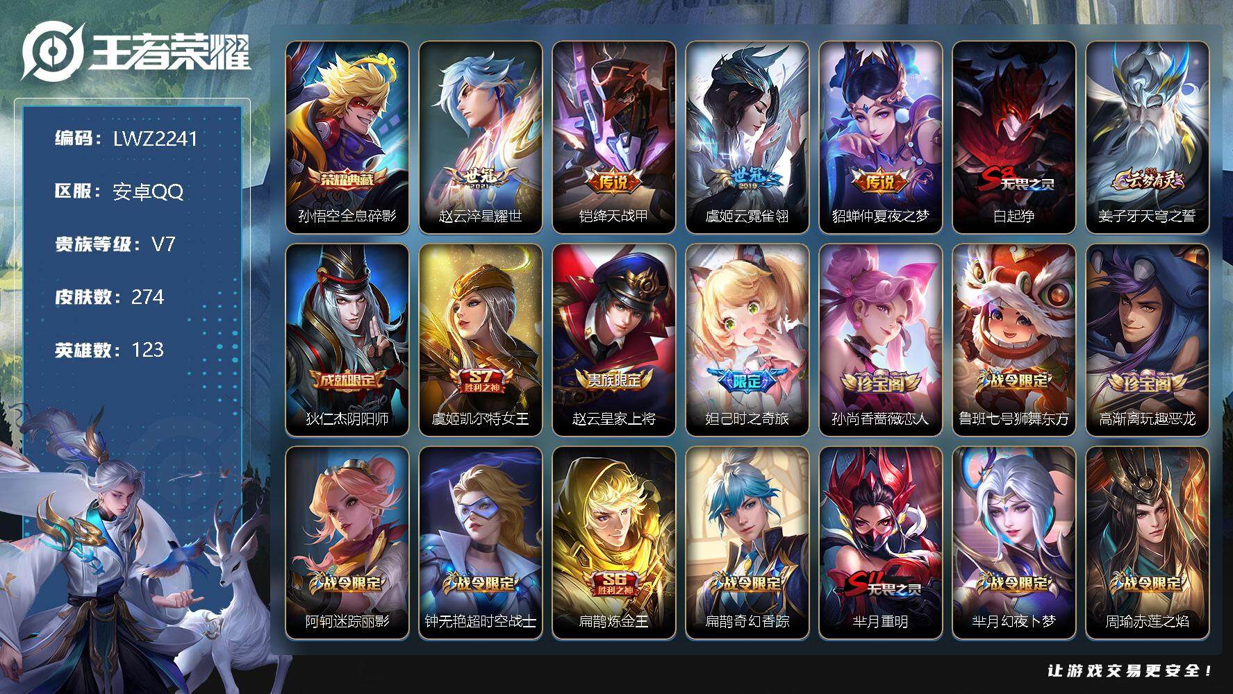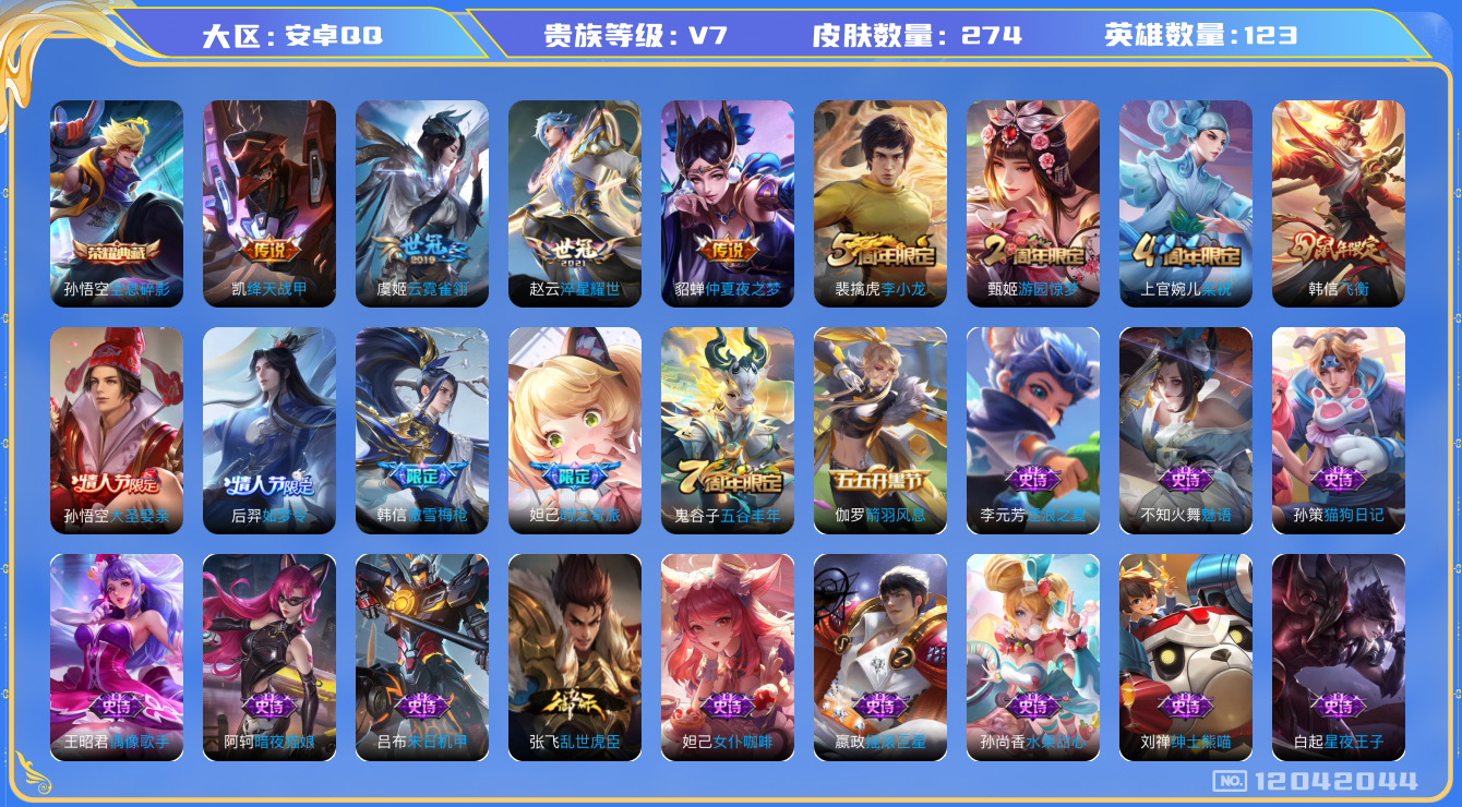 [12042044]【特价急出/详情看图】:安卓Q-V7-至尊星耀IV段位-123英雄-274皮肤-1典藏-4传说-68史诗