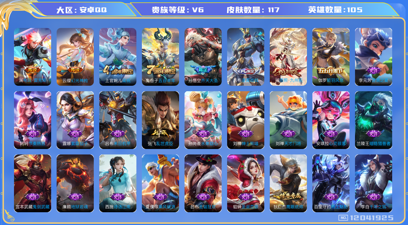 [12041925]【特价急出/详情看图】:安卓Q-V6-永恒钻石V段位-105英雄-117皮肤-4传说-34史诗