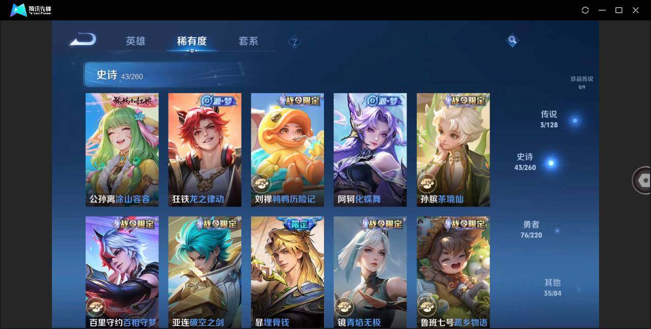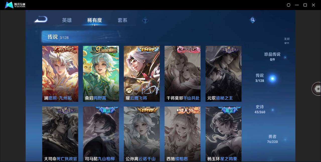 - [12166484]V7 5传说 125英雄 204皮肤 可修改实名 优质装备:云鹰飞将(小将军),绛天战甲(鸡嘴战神),山海·炽霜斩(李信年限) 传说皮:乘龙·问璇玑(孙尚香年限) 珍宝阁皮:妄想食味,蔷薇恋人 限定皮:鸣野蒿,时之彼端,飞衡(韩信年限),高山流水,五谷丰年,青龙志(铠年限),游园惊梦,梁祝,天狼绘梦者,李小龙 史诗皮:化蝶舞,星界战将,破空之剑,战舞者,琥珀纪元伽罗,蔬乡物语(鲁班七号),乘龙·聚宝船(安琪拉年限),苍穹之光,黄金分割率,特工魅影,千年之狐,江河有灵,雪夜绮愿(周瑜),百解令(蒙犽),高渐离燃音魔法,偶像歌手,晚萤,百相守梦(刘备),猫狗日记-孙策,节奏热浪,修罗,女仆咖啡,摇滚巨星,水果甜心,星夜王子,心灵骇客,功夫厨神,德古拉伯爵,暗隐猎兽者,鬼剑武藏,心灵战警,舞动绿茵,地狱岩魂,纤云弄巧,拒霜思,缤纷独角兽,乘风破浪,水晶猎龙者,曙光守护者,金属风暴,圣诞狂欢,圣诞恋歌,鹰眼统帅,魅力维加斯,无心,未来纪元-赵云