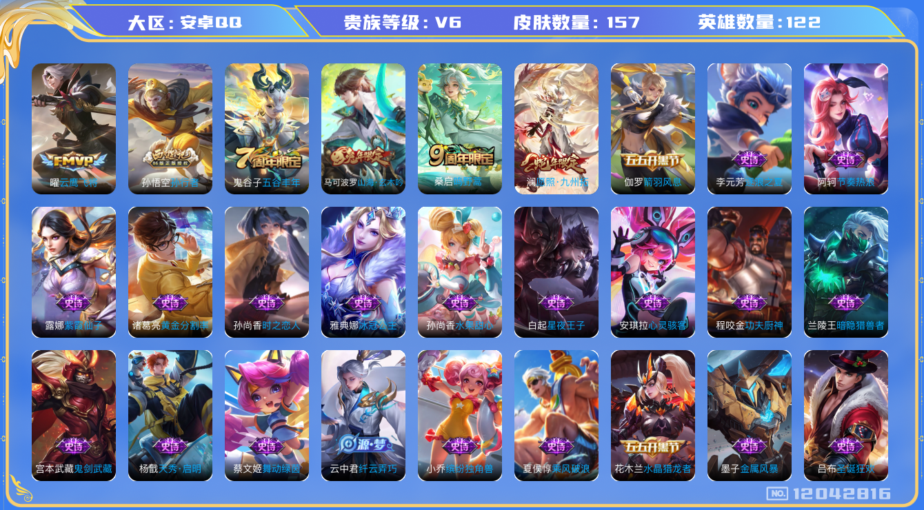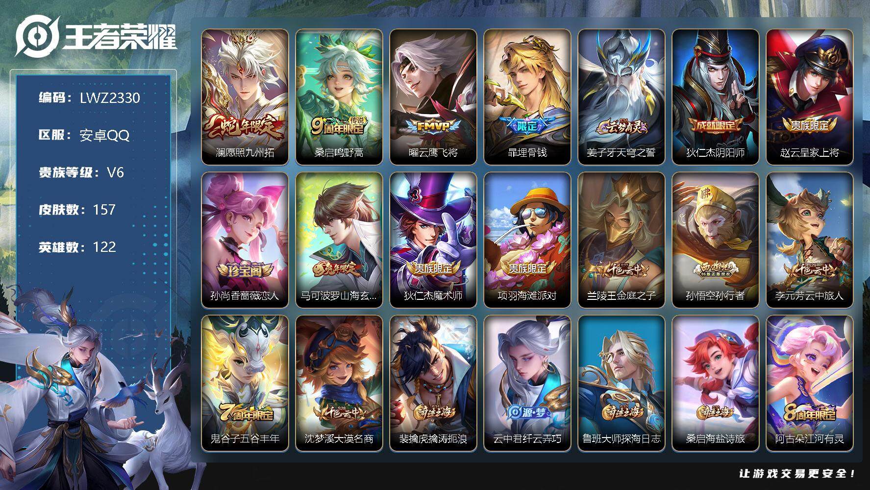 [12042816]【特价急出/详情看图】:安卓Q-V6-至尊星耀V段位-122英雄-157皮肤-3传说-43史诗