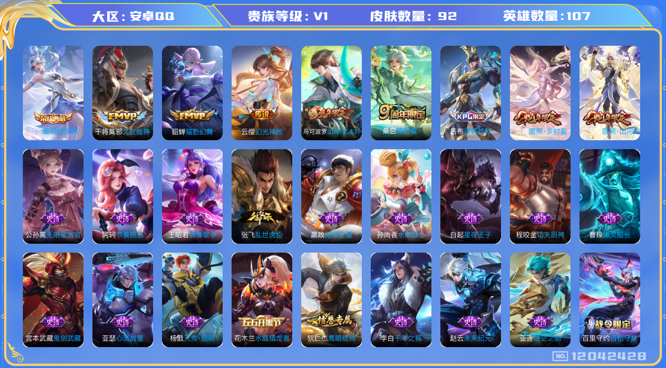 [12042428]【特价急出/详情看图】:安卓Q-V0-永恒钻石I段位-107英雄-92皮肤-1典藏-6传说-21史诗