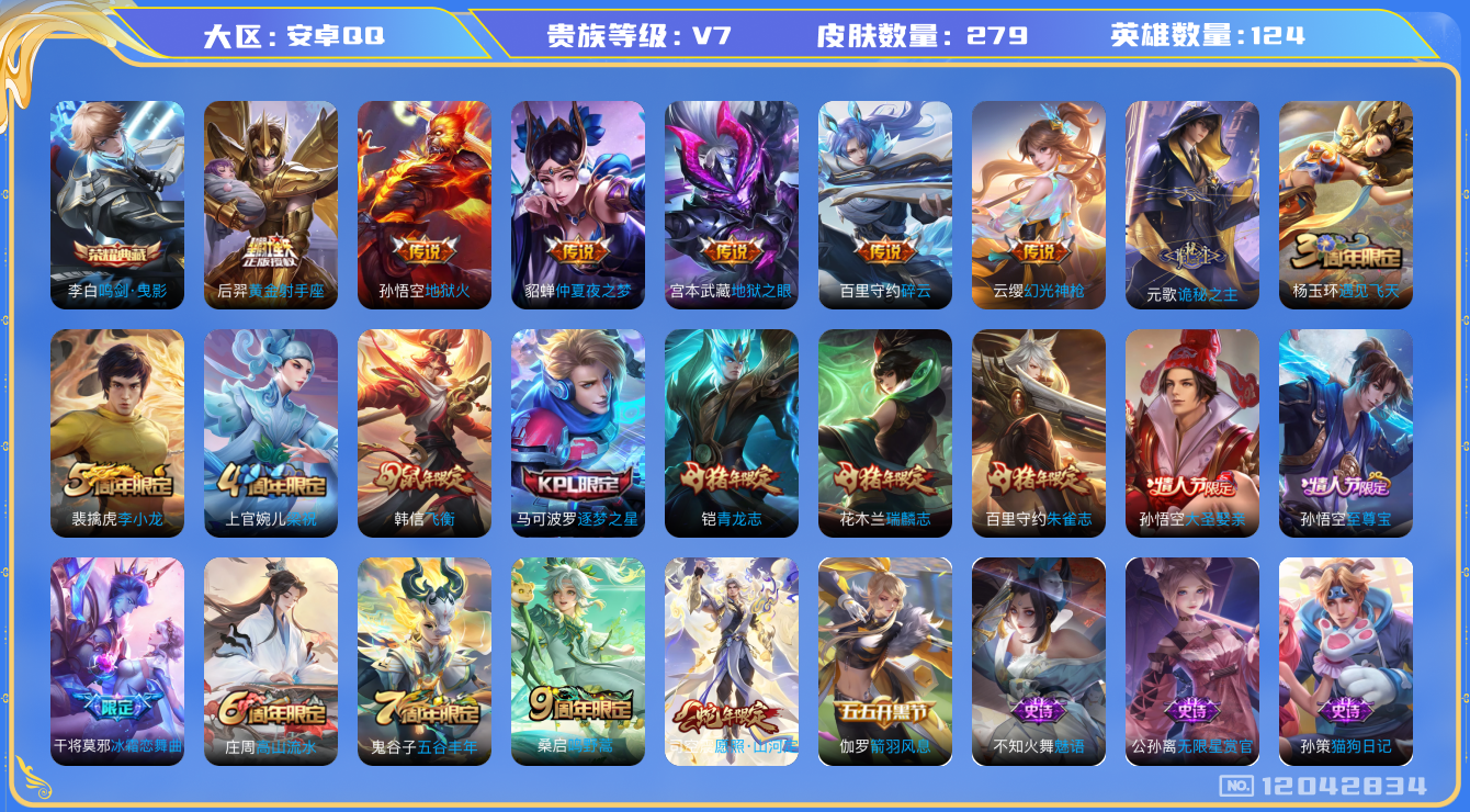 - [11680751]V7 1典藏 1珍品传说 10传说 125英雄 257皮肤 可修改实名 荣耀水晶:幻阙歌(貂蝉典藏) 珍品传说:怪盗基德 传说皮:乘龙·问璇玑(孙尚香年限),乘龙·铭钟鼎(赵云年限),貂蝉曦玄引,幻光神枪,仲夏夜之梦(大飞蛾),云霓雀翎,久胜战神 珍宝阁皮:妄想食味,玩趣恶龙 限定皮:愿照·九州拓(澜年限),愿照·岁时盈(虞姬年限),逐霄战戟,陌上桑,鸣野蒿,遇见飞天,高山流水,李小龙,孙行者 史诗皮:瑰影绮梦,星界战将,茶境仙,绮世丹青,谪仙醉月,鸭鸭历险记-刘禅,龙之律动,百相守梦-百里守约,百相守梦-黄忠,怒海争锋,星界特工,蔬乡物语(鲁班七号),琥珀纪元伽罗,化蝶舞,破空之剑,紫霞仙子,电玩小子(小书包),白龙吟,黄金分割率,特工魅影,永昼,匿光侦查者,江河有灵,高渐离燃音魔法,百解令(蒙犽),蒙恬荣光圣徽,冰冠公主,青蛇,晚萤,魅语,白蛇,暗夜猫娘,龙骑士(小龙虾),末日机甲-吕布,猫狗日记-孙策,乱世虎臣,节奏热浪,女仆咖啡,摇滚巨星,水果甜心,绅士熊喵,天才门将,星夜王子,心灵骇客,功夫厨神,德古拉伯爵,暗隐猎兽者,幽灵船长,鬼剑武藏,暗渊魔法,心灵战警,天秀·启明,地狱岩魂,纤云弄巧,拒霜思,缤纷独角兽,乘风破浪,逐浪之夏,水晶猎龙者,曙光守护者,金属风暴,圣诞狂欢,圣诞恋歌,鹰眼统帅,暗夜贵公子,魅力维加斯,黎明之约,奇遇舞章,未来纪元-赵云