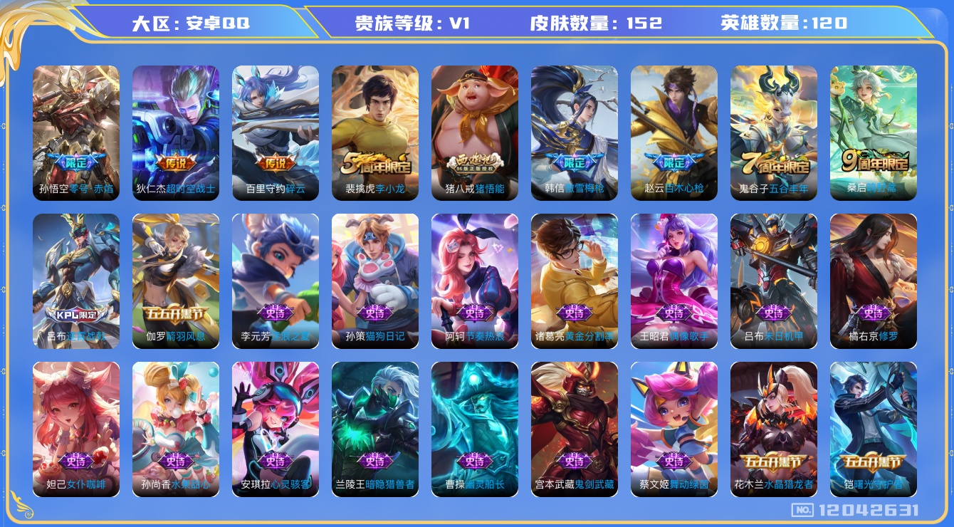[12042631]【特价急出/详情看图】:安卓Q-V0-永恒钻石IV段位-120英雄-152皮肤-4传说-37史诗