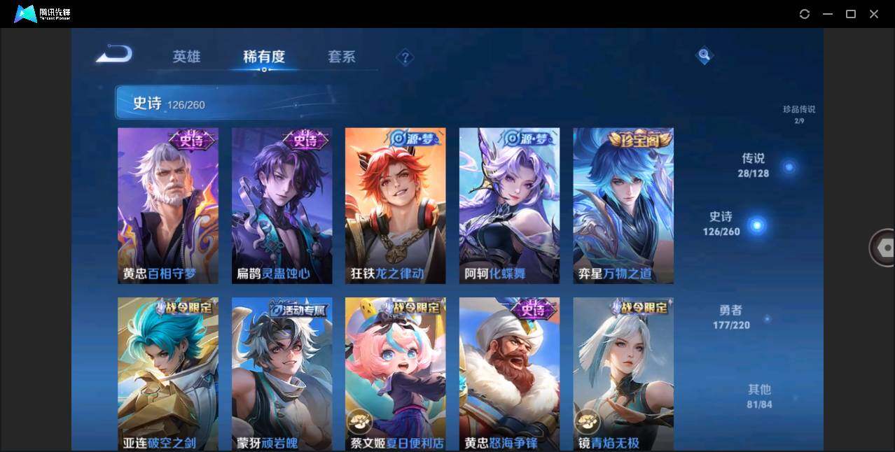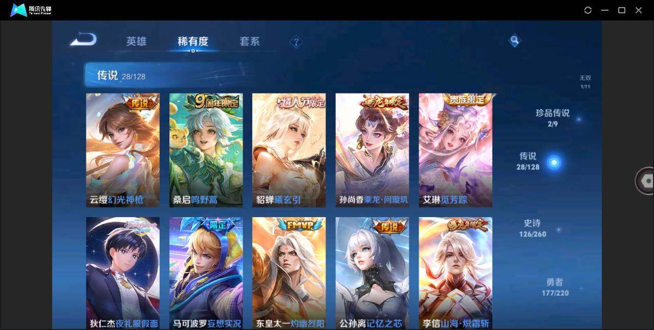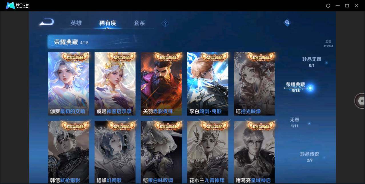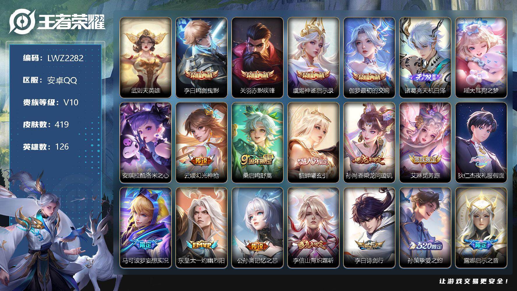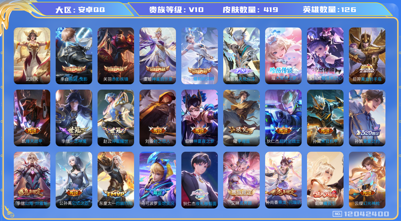 [12042400]【特价急出/详情看图】:安卓Q-V10-最强王者段位-126英雄-419皮肤-4典藏-1无双-2珍品传说-28传说-126史诗