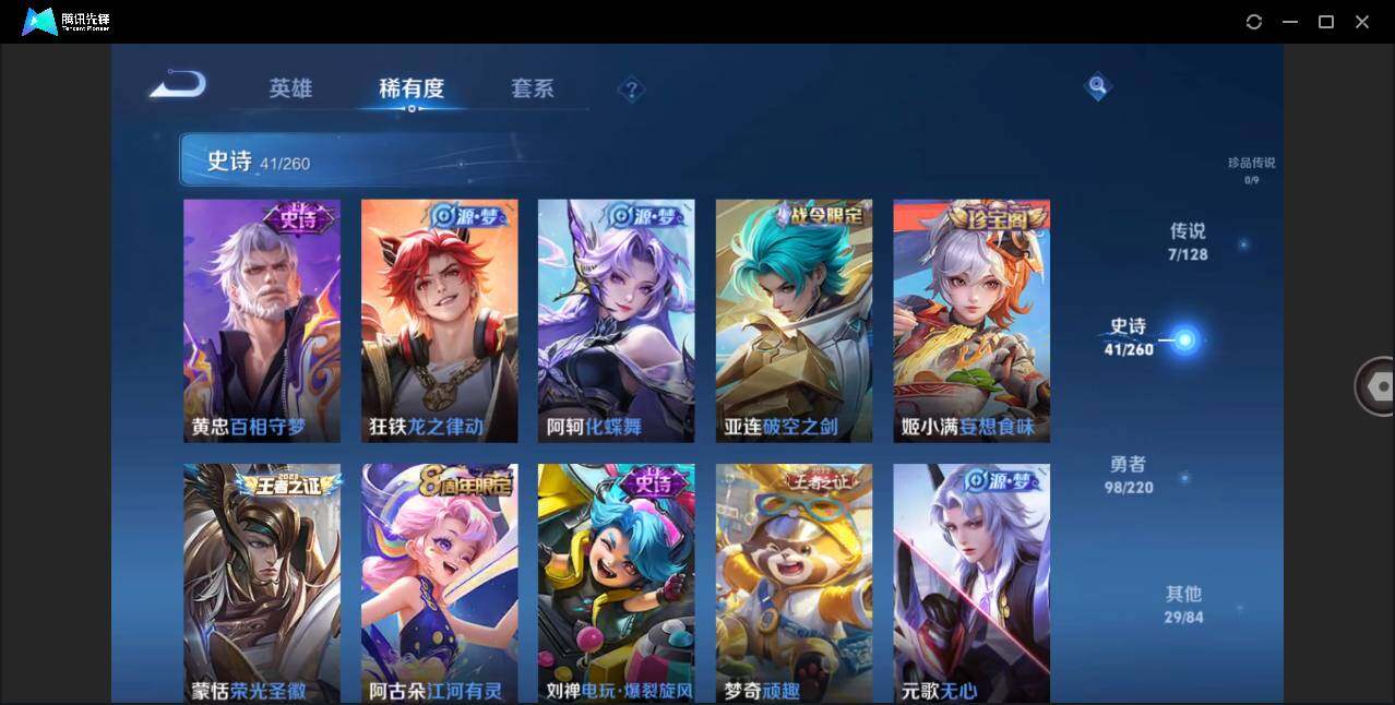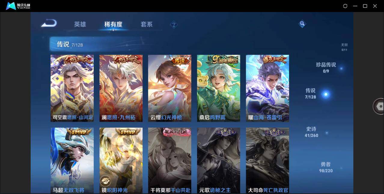 - [12172975]V7 1典藏 5传说 123英雄 144皮肤 可修改实名 优质装备:全息碎影(猴子典藏),云鹰飞将(小将军),猫影幻舞,久胜战神,末日机甲-孙尚香(绿蚂蚱),仲夏夜之梦(大飞蛾) 珍宝阁皮:蔷薇恋人 限定皮:高山流水,游园惊梦,梁祝,天狼溯光者,李小龙 史诗皮:百相守梦-黄忠,紫霞仙子,苍穹之光,白龙吟,黄金分割率,特工魅影,江河有灵,偶像歌手,暗夜猫娘,乱世虎臣,女仆咖啡,摇滚巨星,水果甜心,天才门将,星夜王子,暗隐猎兽者,鬼剑武藏,心灵战警,地狱岩魂,繁星吟游(呼啦呼啦),拒霜思,乘风破浪,逐浪之夏,金属风暴,圣诞狂欢,圣诞恋歌,鹰眼统帅,魅力维加斯,未来纪元-赵云