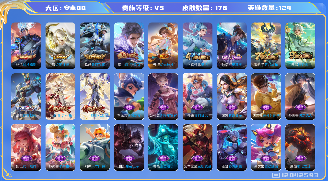 [12042593]【特价急出/详情看图】:安卓Q-V5-至尊星耀III段位-124英雄-176皮肤-1典藏-7传说-41史诗