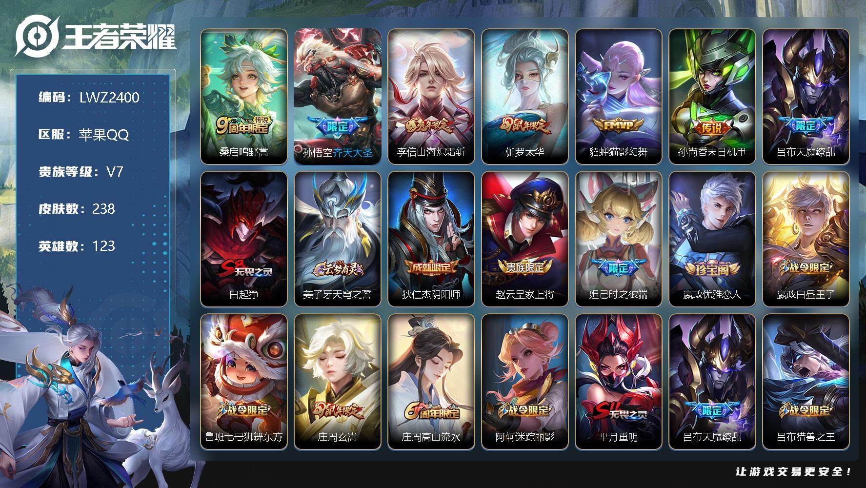 [12101216]【特价急出/详情看图】:苹果Q-V7-永恒钻石II段位-123英雄-238皮肤-7传说-53史诗 【传说皮肤】:桑启鸣野蒿,孙悟空齐天大圣,李信山海炽霜斩,伽罗太华,貂蝉猫影幻舞,孙尚香末日机甲,吕布天魔缭乱 【限定皮肤】:白起狰,姜子牙天穹之誓,狄仁杰阴阳师,赵云皇家上将,妲己时之彼端,嬴政优雅恋人,嬴政白昼王子,鲁班七号狮舞东方,庄周玄嵩,庄周高山流水,阿轲迷踪丽影,芈月重明,吕布天魔缭乱,吕布猎兽之王,周瑜赤莲之焰,元歌无心,夏侯惇朔风刀,甄姬幽恒,曹操烛龙,典韦穷奇,典韦蓝屏警告,典韦岱宗,马可波罗暗影游猎,狄仁杰魔术师,狄仁杰万华元夜,达摩沙漠行僧,项羽海滩派对,老夫子醍醐杖,程咬金演武夺筹,刘邦夺宝奇兵,韩信飞衡,王昭君凤凰于飞,兰陵王驯魔猎人,兰陵王金庭之子,孙悟空至尊宝,孙悟空齐天大圣,牛魔御旌,后羿如梦令,李元芳银河之约,李元芳云中旅人,钟馗神迹守卫,钟馗驱傩正仪,杨玉环遇见飞天,女娲朔望之晖,干将莫邪胡桃夹子,雅典娜单词大作战,蔡文姬繁星吟游,太乙真人饕餮,鬼谷子原初探秘者,鬼谷子五谷丰年,黄忠烈魂,苏烈千军破阵,弈星混沌棋,沈梦溪星空之诺,沈梦溪大漠名商,明世隐疑决卦,裴擒虎李小龙,裴擒虎擒涛扼浪,狂铁御狮,米莱狄御霄,云中君纤云弄巧,李信山海炽霜斩,伽罗太华,盾山御銮,猪八戒西部大镖客,猪八戒猪悟能,上官婉儿梁祝,嫦娥如梦令,嫦娥拒霜思,蒙犽狂想玩偶喵,鲁班大师探海日志,桑启海盐诗旅,艾琳流音漫舞,司空震地狱燃心,阿古朵江河有灵,张良古海寻踪,蒙犽百解令,鬼谷子天穹祈灯,刘邦剑破天穹,程咬金群星魔术团,周瑜熔金海岸 【年限皮肤】:王昭君凤凰于飞,伽罗太华,甄姬幽恒,韩信飞衡,典韦岱宗,庄周玄嵩,黄忠烈魂,李信山海炽霜斩 【赛季限定】:白起狰,芈月重明,夏侯惇朔风刀,曹操烛龙,典韦穷奇,狄仁杰万华元夜,达摩沙漠行僧,老夫子醍醐杖,程咬金演武夺筹,兰陵王金庭之子,张良古海寻踪,牛魔御旌,李元芳云中旅人,钟馗驱傩正仪,太乙真人饕餮,鬼谷子原初探秘者,苏烈千军破阵,弈星混沌棋,沈梦溪大漠名商,明世隐疑决卦,裴擒虎擒涛扼浪,狂铁御狮,米莱狄御霄,盾山御銮,鲁班大师探海日志,桑启海盐诗旅,鬼谷子天穹祈灯,刘邦剑破天穹,姜子牙天穹之誓 【战令限定】:嬴政白昼王子,鲁班七号狮舞东方,阿轲迷踪丽影,吕布猎兽之王,周瑜赤莲之焰,典韦蓝屏警告,马可波罗暗影游猎,