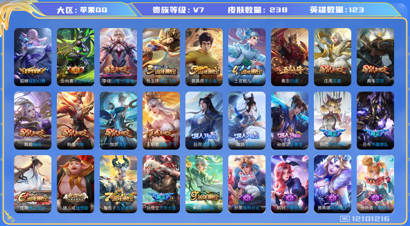- PX_2083658-实名: 可修改 贵族等级: V7 英雄数: 123 皮肤数: 144 传说皮: 黄金狮子座,一念神魔,地狱火,地狱之眼,时之恋人-刘备 限定皮: 李小龙,游园惊梦,时雨天司,天狼绘梦者,五谷丰年