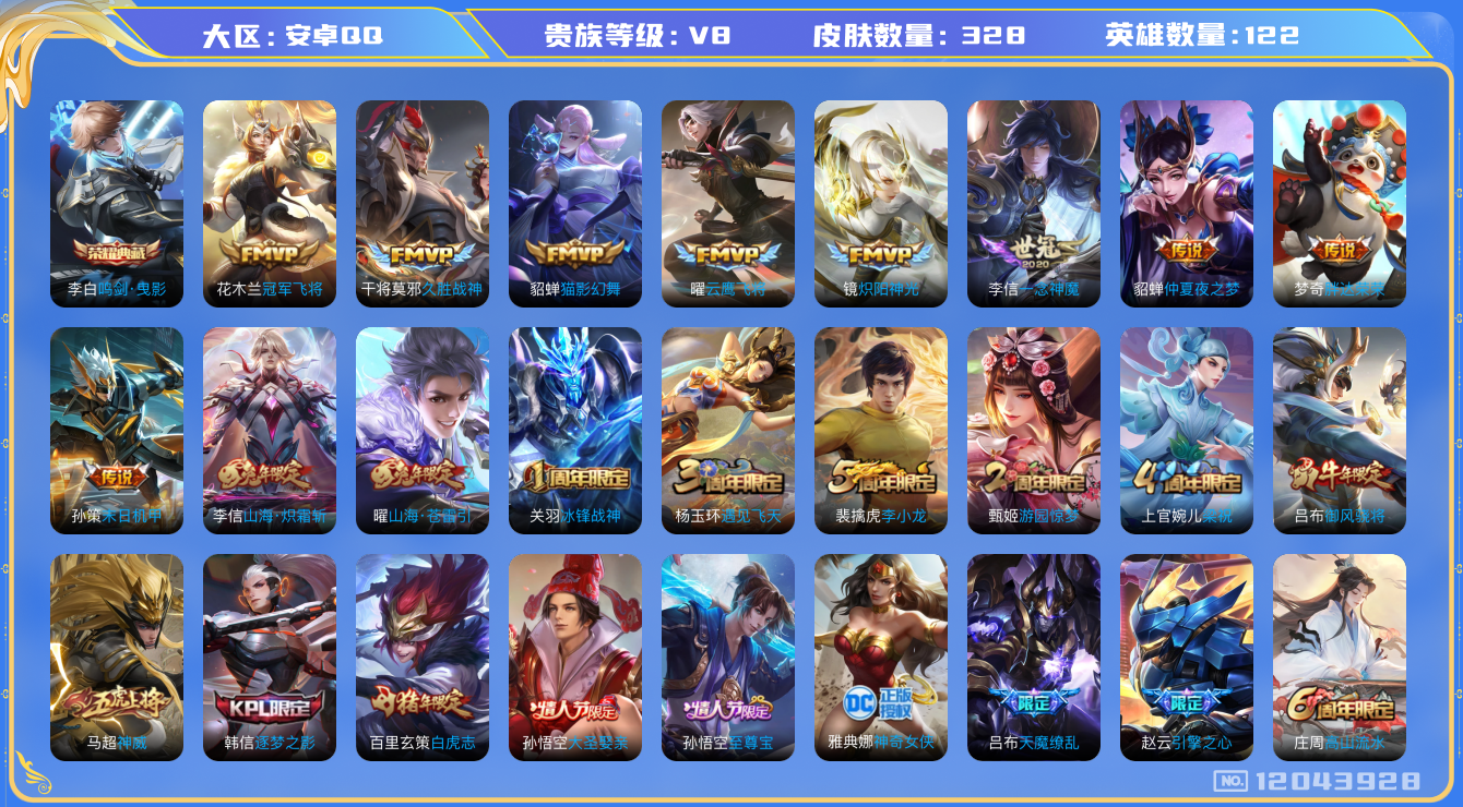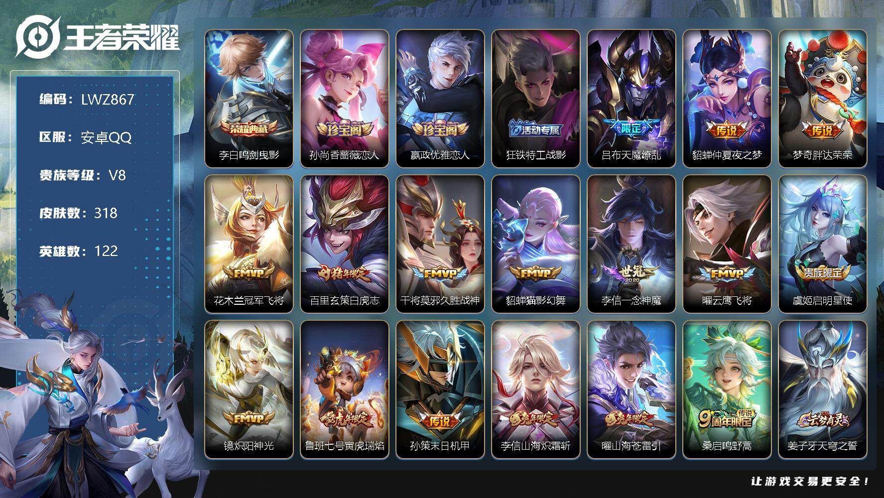 [12043928]暑期末清货/特价急出/永久包赔/商品详情看图【商品标题】:安卓Q-V8-最强王者段位-122英雄-318皮肤-1典藏-16传说-84史诗【荣耀典藏】:李白鸣剑曳影【年限皮肤】:百里玄策白虎志,鲁班七号寅虎瑞焰,吕布御风骁将,马超神威,李信山海炽霜斩,曜山海苍雷引【传说皮肤】:鲁班七号寅虎瑞焰,吕布天魔缭乱,貂蝉仲夏夜之梦,貂蝉猫影幻舞,花木兰冠军飞将,虞姬启明星使,干将莫邪久胜战神,百里玄策白虎志,梦奇胖达荣荣,李信一念神魔,李信山海炽霜斩,孙策末日机甲,曜云鹰飞将,曜山海苍雷引,镜炽阳神光,桑启鸣野蒿【限定皮肤】:姜子牙天穹之誓,狄仁杰阴阳师,赵云皇家上将,墨子神迹守卫,嬴政优雅恋人,嬴政白昼王子,孙尚香蔷薇恋人,鲁班七号寅虎瑞焰,庄周高山流水,阿轲迷踪丽影,钟无艳超时空战士,芈月重明,芈月幻夜卜梦,吕布天魔缭乱,吕布猎兽之王,吕布御风骁将,周瑜赤莲之焰,元歌云间偶戏,元歌无心,夏侯惇朔风刀,甄姬游园惊梦,甄姬落雪兰心,曹操烛龙,典韦穷奇,马可波罗暗影游猎,狄仁杰魔术师,狄仁杰万华元夜,达摩星际陆战队,达摩沙漠行僧,项羽海滩派对,老夫子醍醐杖,老夫子航海奇遇记,关羽冰锋战神,程咬金演武夺筹,刘邦夺宝奇兵,韩信逐梦之影,兰陵王金庭之子,亚瑟潮玩骑士王,孙悟空至尊宝,孙悟空大圣娶亲,牛魔御旌,后羿圣弓游侠,李元芳银河之约,李元芳云中旅人,虞姬启明星使,钟馗驱傩正仪,杨玉环遇见飞天,干将莫邪真爱魔法,雅典娜单词大作战,雅典娜黎明之约,蔡文姬繁星吟游,鬼谷子原初探秘者,鬼谷子五谷丰年,黄忠火炮绅士,苏烈千军破阵,百里玄策白虎志,百里玄策原初追逐者,弈星混沌棋,梦奇顽趣,沈梦溪星空之诺,沈梦溪大漠名商,明世隐疑决卦,裴擒虎李小龙,裴擒虎擒涛扼浪,狂铁御狮,米莱狄御霄,米莱狄胡桃异想国,云中君纤云弄巧,李信山海炽霜斩,盾山御銮,猪八戒西部大镖客,猪八戒猪悟能,上官婉儿梁祝,嫦娥拒霜思,曜山海苍雷引,蒙犽狂想玩偶喵,鲁班大师探海日志,桑启海盐诗旅,艾琳流音漫舞,司空震地狱燃心,阿古朵江河有灵,张良古海寻踪,蒙犽百解令,蒙恬荣光圣徽,鬼谷子天穹祈灯,姬小满妄想食味,沈梦溪龙舞盛年,刘邦剑破天穹,程咬金群星魔术团,刘备异域游侠,周瑜熔金海岸【赛季限定】:芈月重明,夏侯惇朔风刀,曹操烛龙,典韦穷奇,狄仁杰万华元夜,达摩沙漠行僧,老夫子醍醐杖,程咬金演武夺筹,兰陵王金庭之子,张良古海