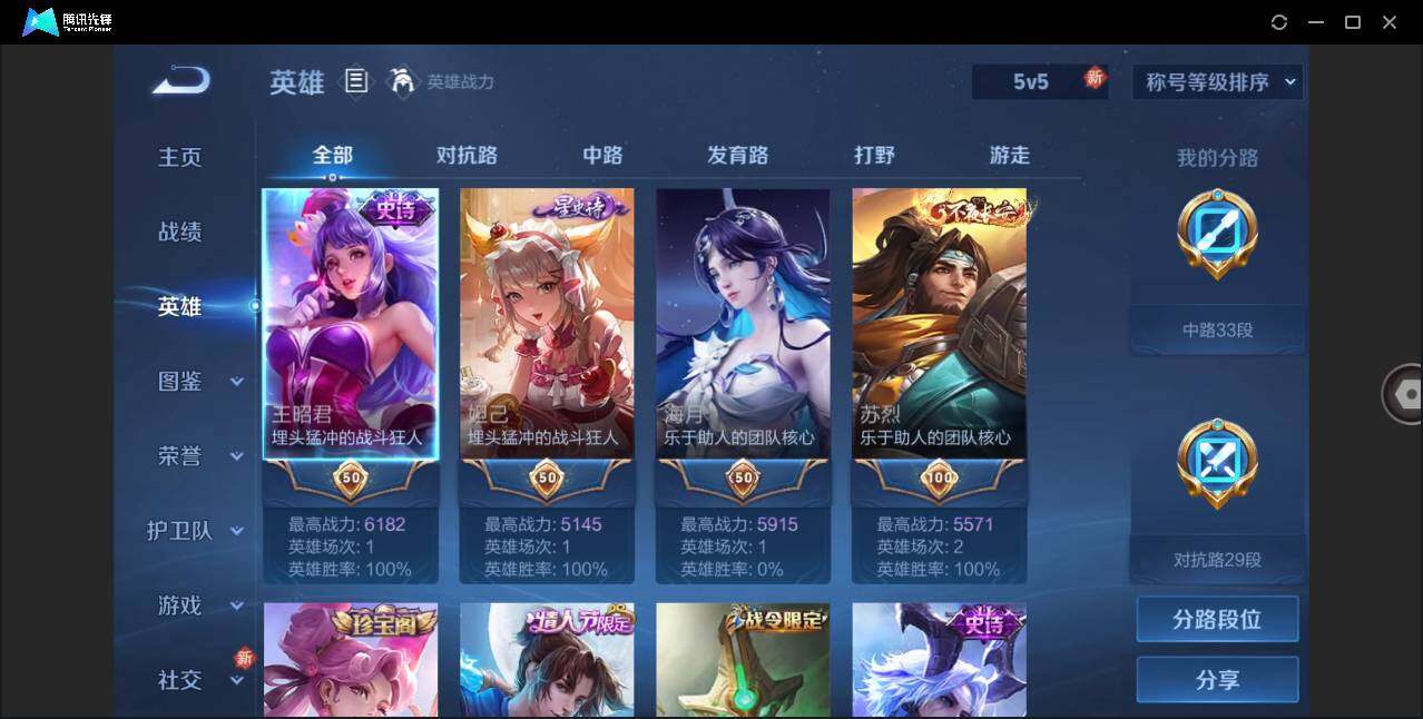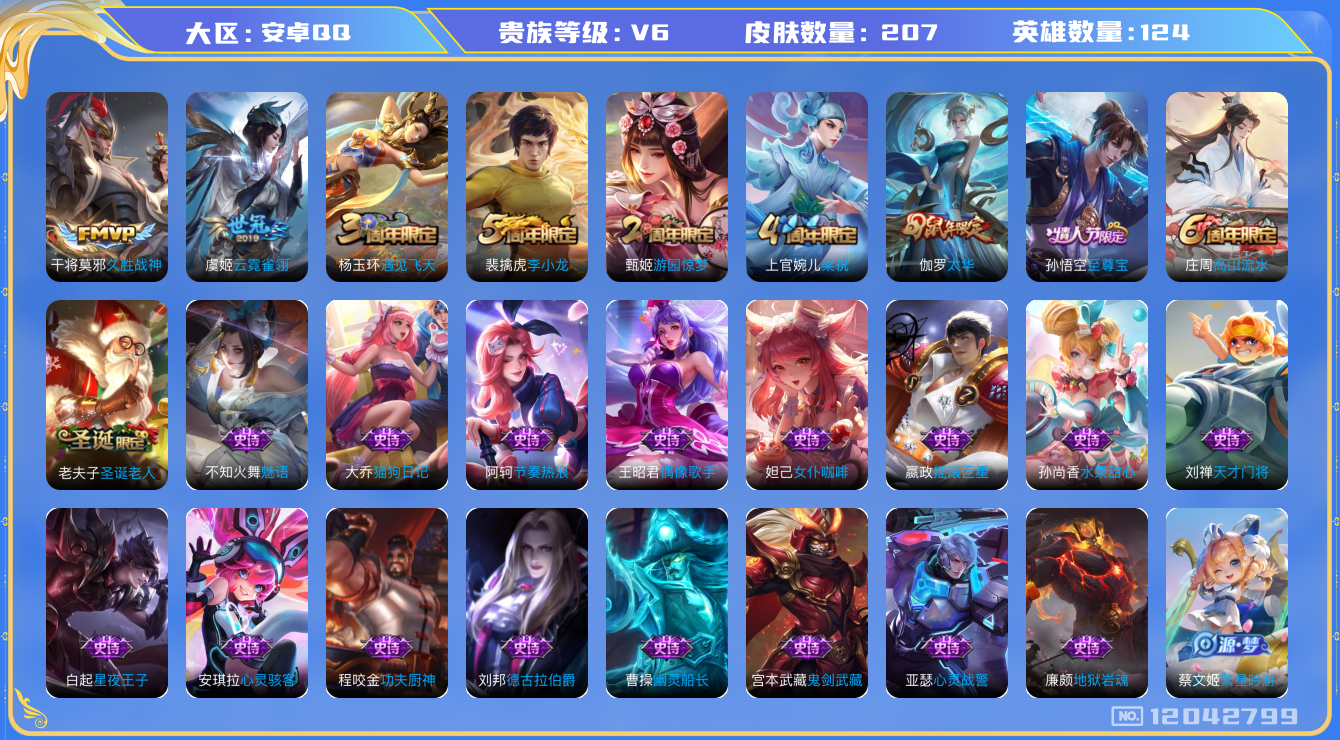 [12042799]中路33段【特价急出/详情看图】:安卓Q-V6-最强王者段位-124英雄-207皮肤-3传说-51史诗