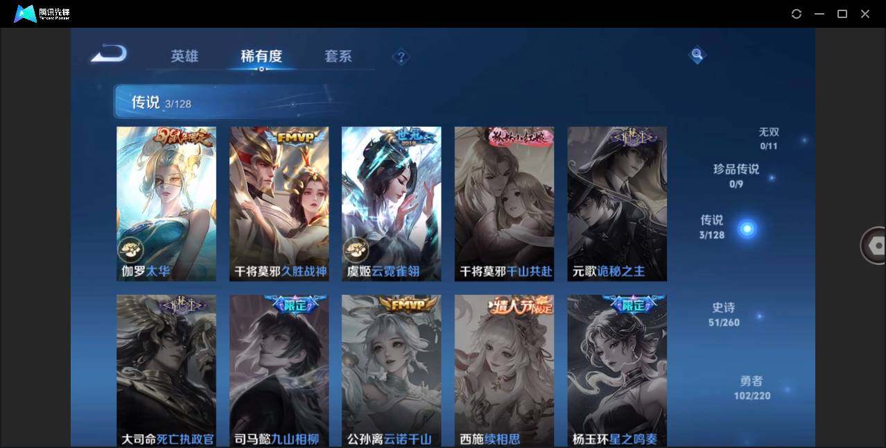 【传说皮肤】:伽罗太华,干将莫邪久胜战神,虞姬云霓雀翎