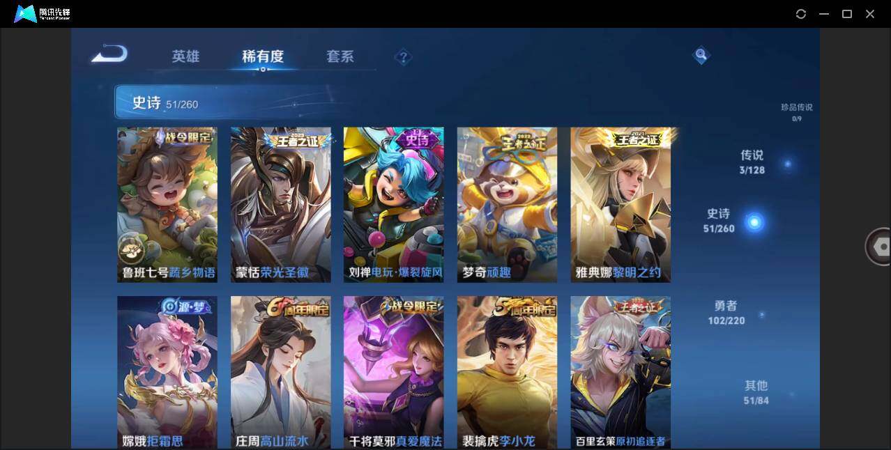 - [12062308]V10 2典藏 3无双 2珍品传说 52传说 123英雄 410皮肤 可修改实名 优质装备:鸣剑·曳影,碎月剑心(李白无双),神鉴启示录,韩信群星魔术团(韩信无双),离恨烟(公孙离无双),江户川柯南,怪盗基德,黄金狮子座,云鹰飞将(小将军),绛天战甲(鸡嘴战神),黄金白羊座,猫影幻舞,炽阳神光,一念神魔,末日机甲-孙尚香(绿蚂蚱),仲夏夜之梦(大飞蛾),零号·赤焰,时之恋人-刘备(电焊工),超时空战士-狄仁杰,末日机甲-孙策,无双飞将,碎云,山海·炽霜斩(李信年限),山海·琳琅生(小乔年限),炽翼辉光(娃娃菜牛角包),画中仙,浮生妄,记忆之芯(机甲兔),电玩·雷克斯,妄想实况,遇见神鼓,霜月吟,澜逐花归海,艾琳觅芳踪,琥珀纪元铠,琥珀纪元马超,黄金天蝎座,云中君群星魔术团,朵莉亚心动手记 传说皮:乘龙·问璇玑(孙尚香年限),续相思 珍宝阁皮:妄想食味,胡桃夹子 限定皮:愿照·九州拓(澜年限),愿照·福禄聚(蔡文姬年限),愿照·岁时盈(虞姬年限),愿照·山河定(司空震年限),愿照·众生和(妲己年限),愿照·千秋盛(女娲年限),逐霄战戟,映山客,陌上桑,鸣野蒿,夏侯惇霜北刀,至尊宝,太华(伽罗年限),武陵仙君(小桃花),傲雪梅枪,时之彼端,白鹤梁神女,魔法小厨娘,时雨天司(水龙头),神威(电光马子),飞衡(韩信年限),至美·乘鲤谣,遇见飞天,齐天大圣,匿光决锋者,五谷丰年,游园惊梦,梁祝,岱宗(典韦年限),祈雪灵祝(雪兔子),李小龙,朱雀志(守约年限),辉光之辰,霸王别姬-项羽,霸王别姬-虞姬,圣诞老人,孙行者,蜜橘之夏,寅虎·赤拳(老虎年限),百木心枪,玉兔公主,启示之音,深海之息(深海大菠萝) 史诗皮:绮世丹青,星界战将,谪仙醉月,茶境仙,怒海争锋,炽弈燎原,撼地雄心,破空之剑,战舞者,涂山红红,东方月初,蒙犽顽岩魄,埋骨钱,芈月浮光幕影,海诺心动手记,琥珀纪元伽罗,夜落电台,上官婉儿群星魔术团,奇遇星旅,蔬乡物语(鲁班七号),百相守梦-百里守约,星界特工,遇见神鹿,紫霞仙子,白龙吟,黄金分割率,特工魅影,千年之狐,江河有灵,匿光侦查者,真我赫兹(百里守约),浮梦罗烟,魅语,百解令(蒙犽),高渐离燃音魔法,蒙恬荣光圣徽,无限星赏官,冰冠公主,白蛇,晚萤,银翎春语,末日机甲-吕布,猫狗日记-孙策,猫狗日记-大乔,乱世虎臣,节奏热浪,女仆咖啡,摇滚巨星,水果甜心,