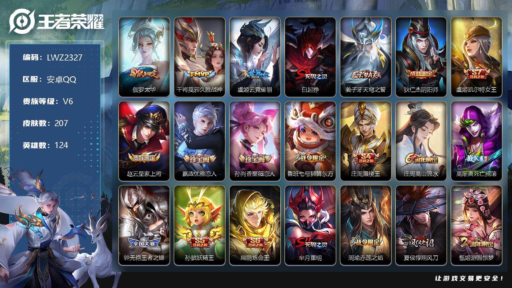 [12042799]中路33段【特价急出/详情看图】:安卓Q-V6-最强王者段位-124英雄-207皮肤-3传说-51史诗 【传说皮肤】:伽罗太华,干将莫邪久胜战神,虞姬云霓雀翎 【限定皮肤】:白起狰,姜子牙天穹之誓,狄仁杰阴阳师,虞姬凯尔特女王,赵云皇家上将,嬴政优雅恋人,孙尚香蔷薇恋人,鲁班七号狮舞东方,庄周蜃楼王,庄周高山流水,高渐离死亡摇滚,钟无艳王者之锤,孙膑妖精王,扁鹊炼金王,芈月重明,周瑜赤莲之焰,夏侯惇朔风刀,甄姬游园惊梦,曹操烛龙,典韦穷奇,狄仁杰魔术师,狄仁杰万华元夜,达摩沙漠行僧,项羽海滩派对,老夫子圣诞老人,老夫子醍醐杖,程咬金演武夺筹,兰陵王驯魔猎人,兰陵王金庭之子,亚瑟狮心王,孙悟空至尊宝,牛魔御旌,后羿圣弓游侠,李元芳银河之约,李元芳云中旅人,钟馗神迹守卫,钟馗驱傩正仪,杨玉环遇见飞天,女娲朔望之晖,干将莫邪真爱魔法,雅典娜黎明之约,蔡文姬繁星吟游,太乙真人饕餮,鬼谷子原初探秘者,苏烈千军破阵,百里玄策原初追逐者,弈星混沌棋,梦奇顽趣,沈梦溪星空之诺,沈梦溪大漠名商,明世隐疑决卦,裴擒虎李小龙,裴擒虎擒涛扼浪,狂铁御狮,米莱狄御霄,伽罗太华,盾山御銮,上官婉儿梁祝,嫦娥拒霜思,鲁班大师探海日志,桑启海盐诗旅,张良古海寻踪,蒙恬荣光圣徽,鬼谷子天穹祈灯,鲁班七号蔬乡物语,李元芳蔬乡物语,刘邦剑破天穹 【年限皮肤】:伽罗太华 【赛季限定】:庄周蜃楼王,孙膑妖精王,扁鹊炼金王,白起狰,芈月重明,夏侯惇朔风刀,曹操烛龙,典韦穷奇,狄仁杰万华元夜,达摩沙漠行僧,老夫子醍醐杖,程咬金演武夺筹,兰陵王金庭之子,张良古海寻踪,亚瑟狮心王,牛魔御旌,李元芳云中旅人,虞姬凯尔特女王,钟馗驱傩正仪,雅典娜黎明之约,太乙真人饕餮,鬼谷子原初探秘者,苏烈千军破阵,百里玄策原初追逐者,弈星混沌棋,梦奇顽趣,沈梦溪大漠名商,明世隐疑决卦,裴擒虎擒涛扼浪,狂铁御狮,米莱狄御霄,盾山御銮,鲁班大师探海日志,桑启海盐诗旅,鬼谷子天穹祈灯,蒙恬荣光圣徽,刘邦剑破天穹,姜子牙天穹之誓 【战令限定】:鲁班七号狮舞东方,周瑜赤莲之焰,兰陵王驯魔猎人,后羿圣弓游侠,李元芳银河之约,钟馗神迹守卫,女娲朔望之晖,干将莫邪真爱魔法,沈梦溪星空之诺,鲁班七号蔬乡物语,李元芳蔬乡物语 【史诗皮肤】:钟无艳王者之锤,赵云皇家上将,貂蝉圣诞恋歌,老夫子圣诞老人,甄姬冰雪圆舞曲,王昭君偶像歌手,狄仁杰魔术师,廉颇地