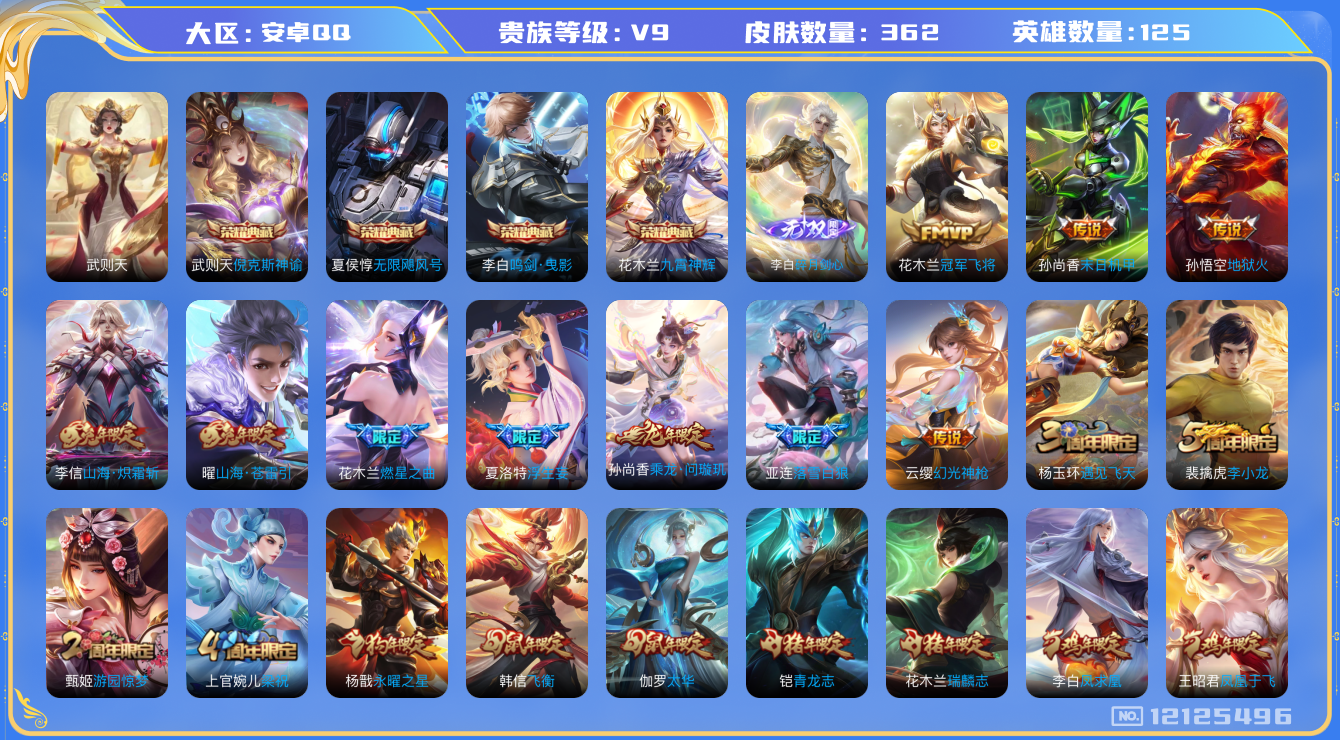 [12125496]【特价急出/详情看图】:安卓Q-V9-永恒钻石I段位-126英雄-362皮肤-4典藏-1无双-21传说-103史诗