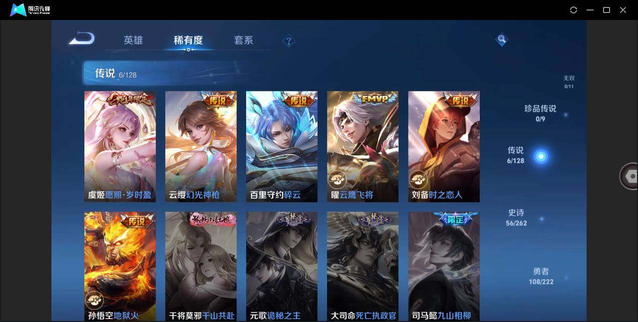 - [12112010]V7 8传说 125英雄 254皮肤 可修改实名 优质装备:末日机甲-孙尚香(绿蚂蚱),地狱火,地狱之眼,涂山容容 珍宝阁皮:胡桃夹子 限定皮:鸣野蒿,夏侯惇霜北刀,至尊宝,白虎志(电光耗子),凤求凰(白切鸡),时之彼端,遇见飞天,高山流水,齐天大圣,降魔,五谷丰年,青龙志(铠年限),游园惊梦,梁祝,御风骁将(吕布年限),岱宗(典韦年限),李小龙,朱雀志(守约年限),辉光之辰,大圣娶亲,美猴王 史诗皮:百相守梦-周瑜,怒海争锋,百相守梦-黄忠,苍穹之光,千年之狐,匿光侦查者,魅语,冰冠公主,晚萤,猫狗日记-孙策,乱世虎臣,修罗,摇滚巨星,水果甜心,绅士熊喵,天才门将,心灵骇客,功夫厨神,德古拉伯爵,暗隐猎兽者,幽灵船长,鬼剑武藏,心灵战警,纤云弄巧,繁星吟游(呼啦呼啦),乘风破浪,箭羽风息,金属风暴,原初追逐者,圣诞狂欢,圣诞恋歌,鹰眼统帅,魅力维加斯,赏金猎手,无心,未来纪元-赵云