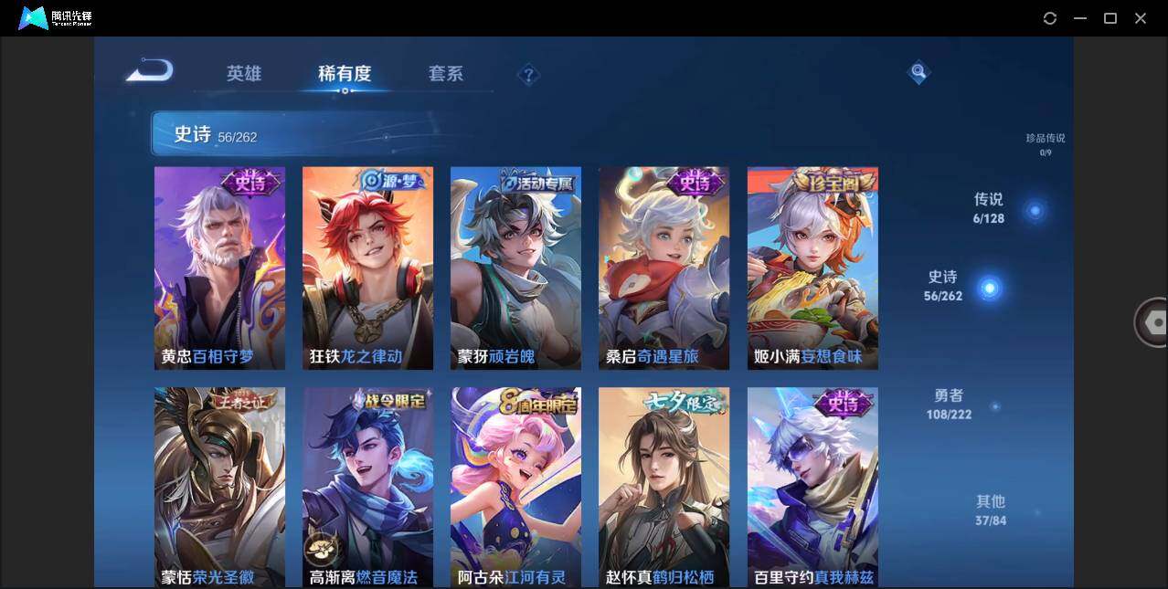- [11764288]V4 1典藏 2传说 122英雄 126皮肤 可修改实名 优质装备:弑枪猎影(韩信典藏) 传说皮:幻光神枪 珍宝阁皮:蔷薇恋人 限定皮:逐霄战戟,鸣野蒿,五谷丰年,游园惊梦,孙行者 史诗皮:百相守梦-黄忠,紫霞仙子,千年之狐,江河有灵,百解令(蒙犽),电玩·爆裂旋风,末日机甲-吕布,乱世虎臣,节奏热浪,女仆咖啡,水果甜心,天才门将,德古拉伯爵,暗隐猎兽者,鬼剑武藏,乘风破浪,水晶猎龙者,金属风暴,圣诞恋歌,鹰眼统帅,魅力维加斯,无心,未来纪元-赵云