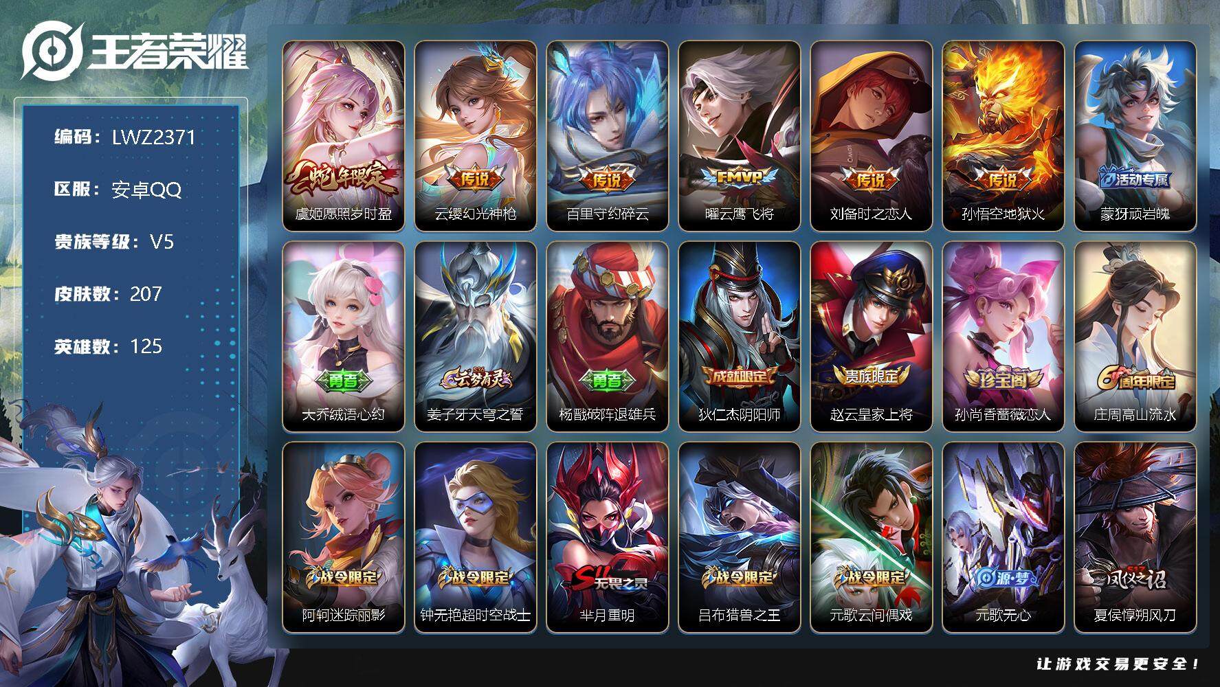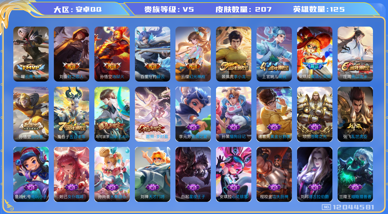 [12044581]【特价急出/详情看图】:安卓Q-V5-永恒钻石III段位-125英雄-207皮肤-6传说-56史诗