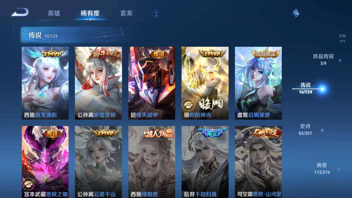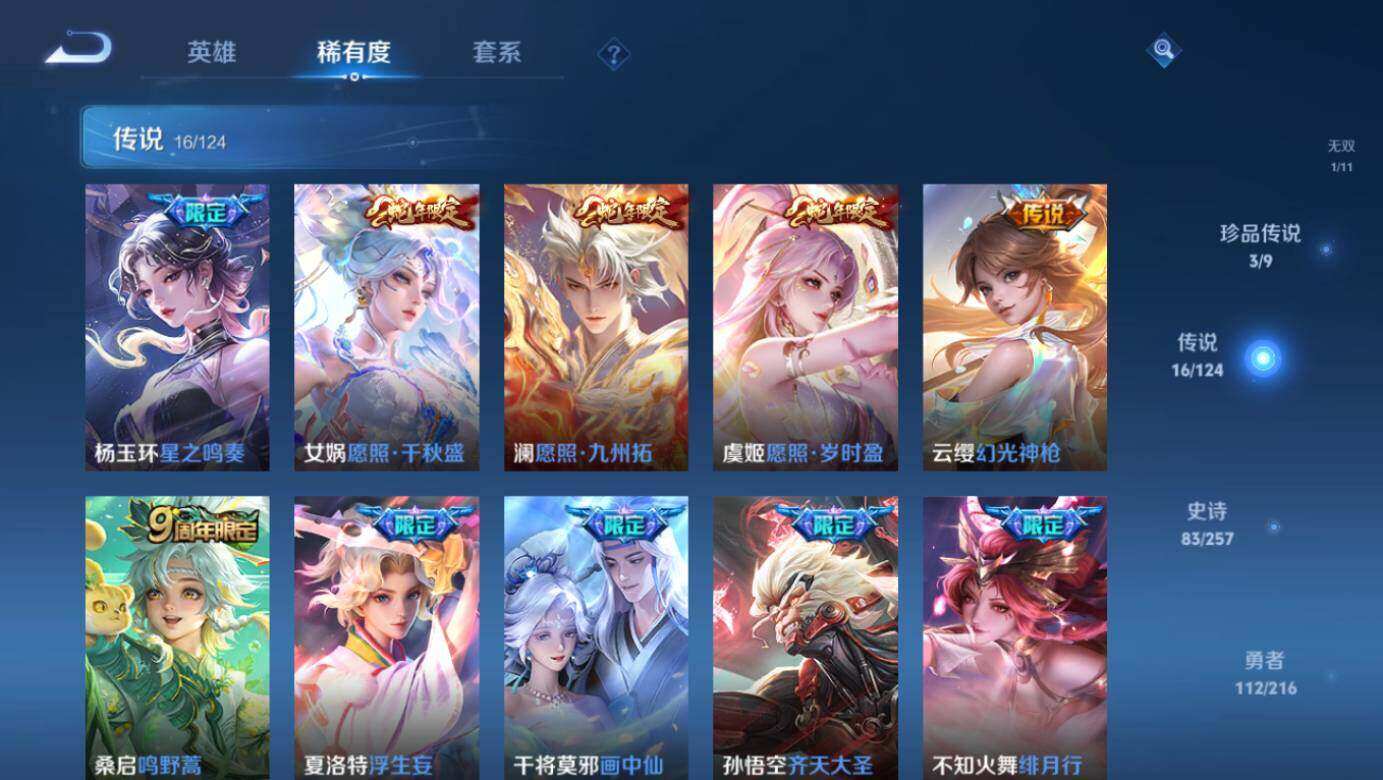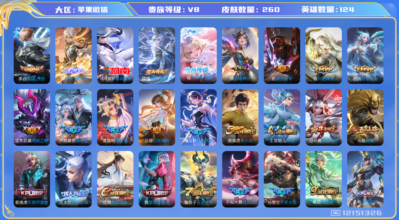- PX_2099382-贵族等级: V6 英雄数: 123 皮肤数: 147 荣耀水晶: 最初的交响 珍品传说: 怪盗基德,器灵·落星盏 传说皮: 山海·炽霜斩,幻光神枪 限定皮: 李小龙,五谷丰年,鸣野蒿,逐霄战戟,愿照·千秋盛