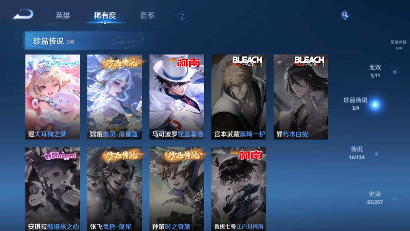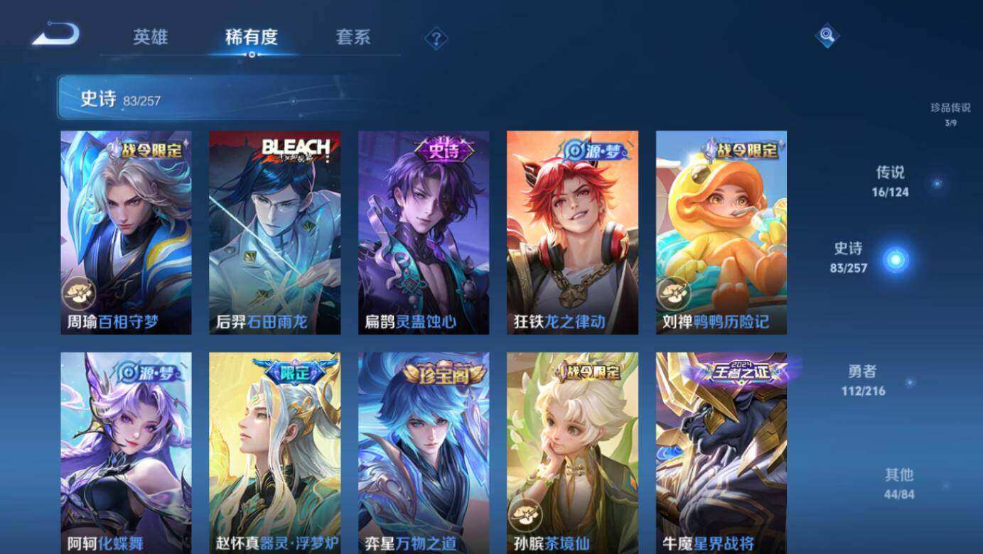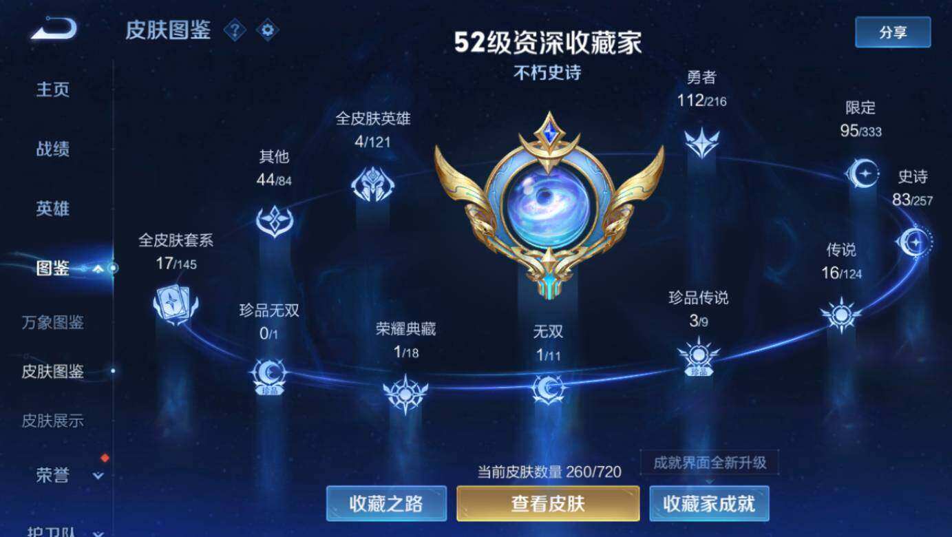 - PX_2099382-贵族等级: V6 英雄数: 123 皮肤数: 147 荣耀水晶: 最初的交响 珍品传说: 怪盗基德,器灵·落星盏 传说皮: 山海·炽霜斩,幻光神枪 限定皮: 李小龙,五谷丰年,鸣野蒿,逐霄战戟,愿照·千秋盛