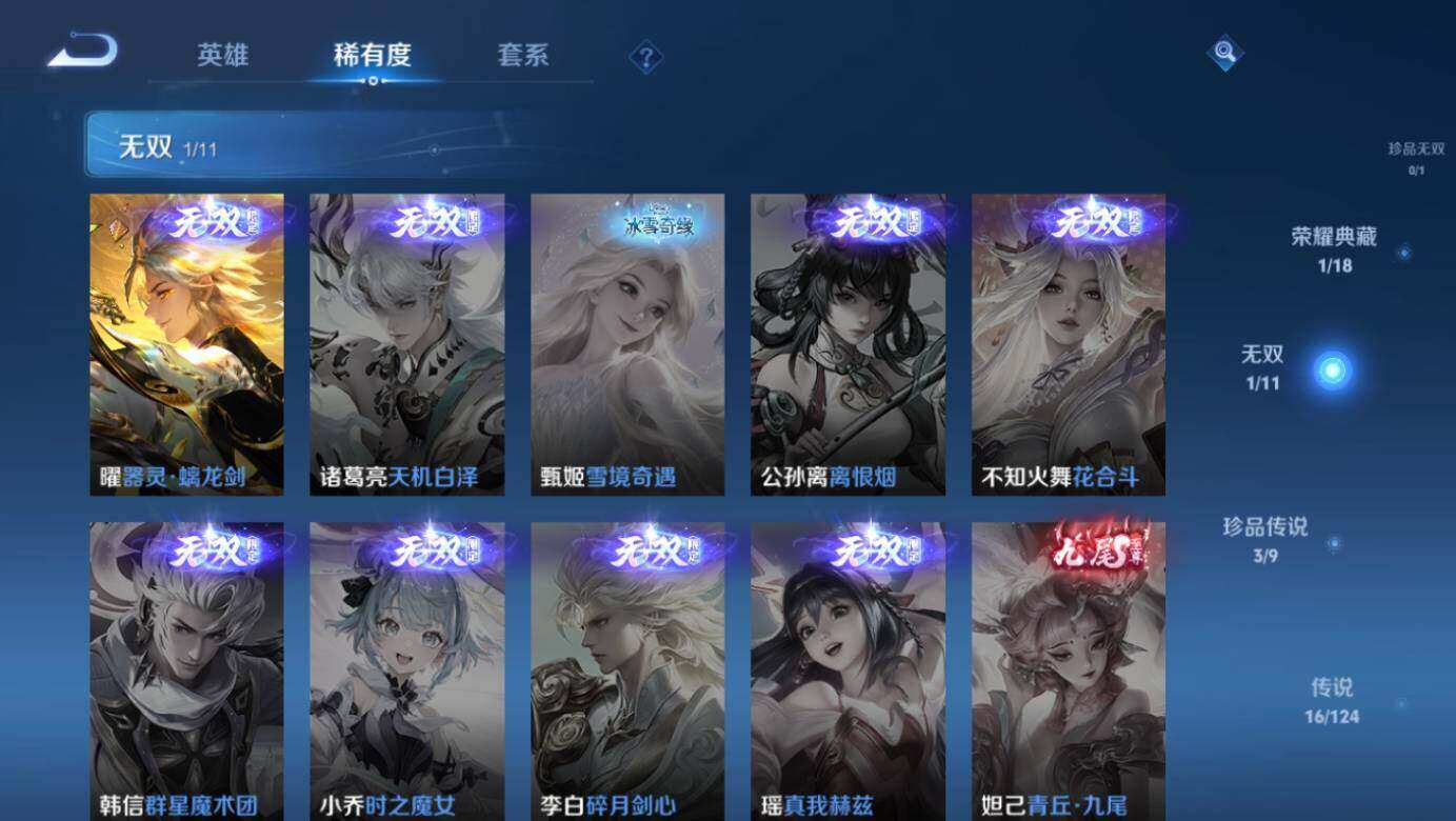 裴擒虎李小龙,上官婉儿梁祝,公孙离祈雪灵祝,马超神威,裴擒虎天狼狩猎者,花木兰默契交锋,镜匿光追影者,不知火舞绯月行,桑启鸣野蒿,澜愿照·九州拓,虞姬愿照·岁时盈,女娲愿照·千秋盛