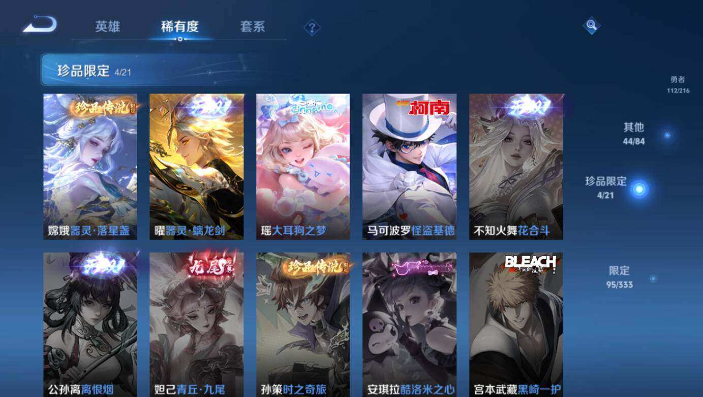 - PX_2099904-53 安卓QQ/非凡王者/162皮肤/115英雄/1典藏/0珍品无双/0无双/2珍品传说/10传说/44史诗/3稀有英雄 【2 珍品传说】怪盗基德 马可波罗,江户川柯南 鲁班七号, 【1 典藏皮肤】银白咏叹调 铠, 【10 传说皮肤】逐花归海 澜,无双飞将 马超,游龙清影 西施,炽阳神光 镜,霜月吟 露娜,久胜战神 干将莫邪,一念神魔 李信,霜北刀 夏侯惇,愿照·九州拓 澜,