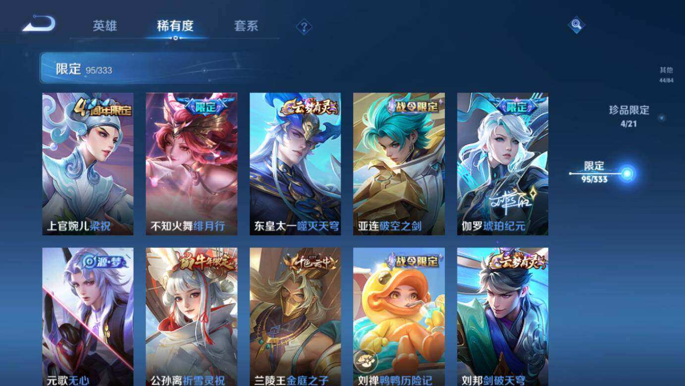 【限定皮肤】:暃埋骨钱,蒙犽顽岩魄,蔡文姬夏日便利店,虞姬夏日便利店,姜子牙天穹之誓,杨戬破阵退雄兵,李白谪仙醉月,狄仁杰阴阳师,赵云皇家上将,孙尚香蔷薇恋人,庄周高山流水,阿轲迷踪丽影,元歌无心,狄仁杰魔术师,达摩沙漠行僧,项羽海滩派对,王昭君午后时光,兰陵王金庭之子,花木兰默契交锋,不知火舞绯月行,孙悟空齐天大圣,李元芳云中旅人,虞姬启明星使,钟馗神迹守卫,钟馗驱傩正仪,干将莫邪画中仙,雅典娜黎明之约,鬼谷子五谷丰年,苏烈千军破阵,公孙离祈雪灵祝,沈梦溪大漠名商,裴擒虎天狼狩猎者,裴擒虎李小龙,裴擒虎擒涛扼浪,狂铁电玩高手,盾山梦圆繁星,上官婉儿梁祝,西施玲珑珍味,鲁班大师探海日志,镜匿光追影者,桑启海盐诗旅,夏洛特浮生妄,戈娅驭风魔法,艾琳流音漫舞,司空震地狱燃心,阿古朵江河有灵,张良古海寻踪,蒙恬荣光圣徽,高渐离燃音魔法,妲己灵卜魔法,鬼谷子天穹祈灯,伽罗琥珀纪元,沈梦溪龙舞盛年,刘邦剑破天穹,镜青焰无极,项羽苍威无极,海诺心动手记,周瑜熔金海岸